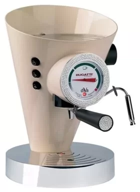 Эспрессо-машина Bugatti в кремовом цвете с инкрустацией Swarovski — отделка на циферблате и ручке держателя фильтра добавляет неповторимости изделию. Модель позволяет приготовить кофе в капсулах, молотый на 1 или 2 чашки. Время фильтрации кофе составляет всего 25 секунд.
