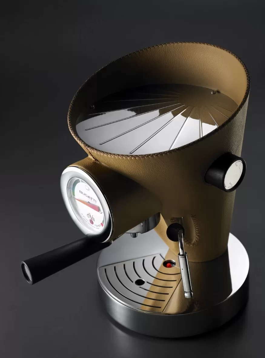 Эспрессо-машина покрытая черной кожей. Модель позволяет приготовить кофе в капсулах, молотый на 1 или 2 чашки. Время фильтрации кофе составляет всего 25 секунд.