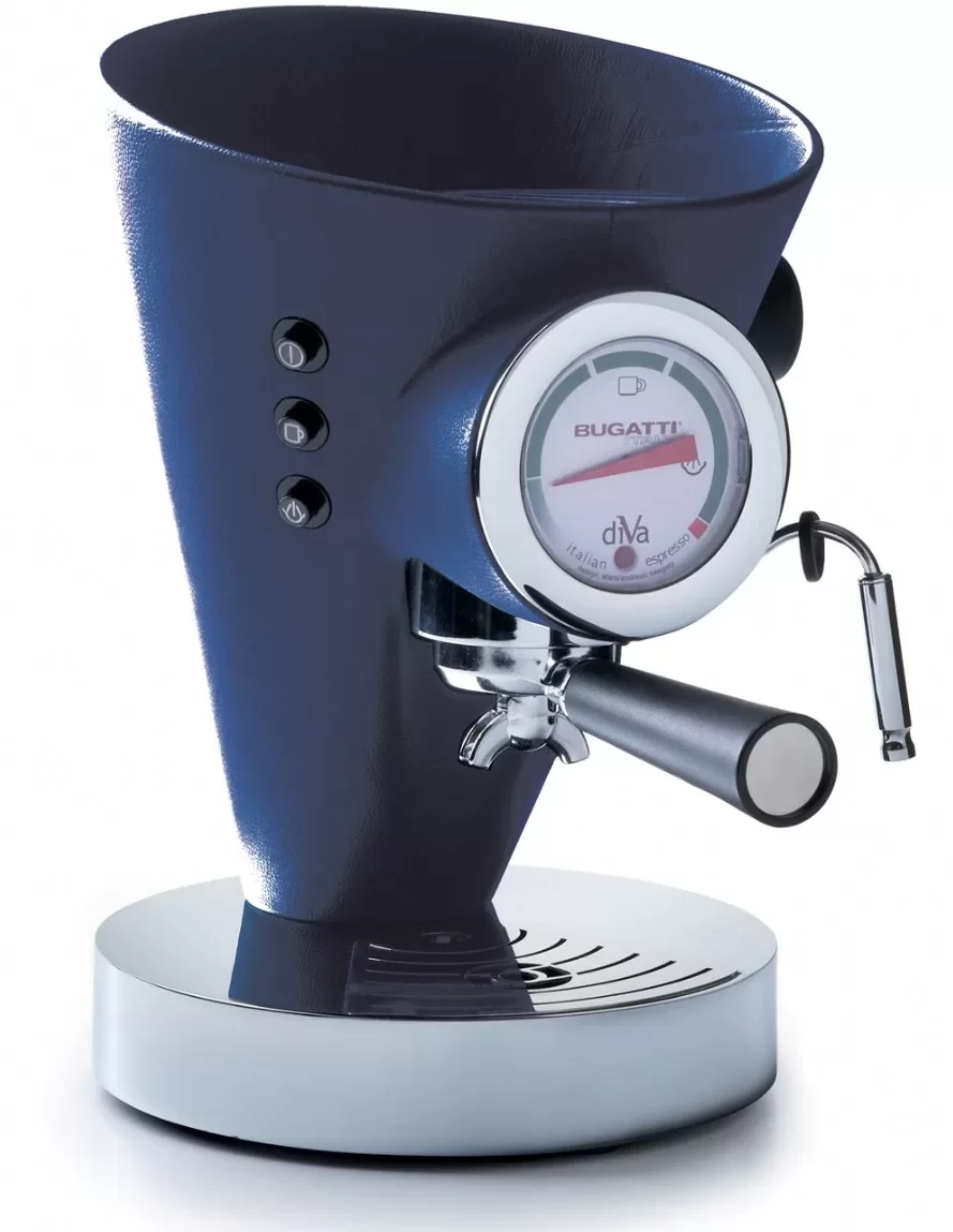 Эспрессо-машина Bugatti облаченная в кожу синего цвета. Модель позволяет приготовить кофе в капсулах, молотый на 1 или 2 чашки. Время фильтрации кофе составляет всего 25 секунд.