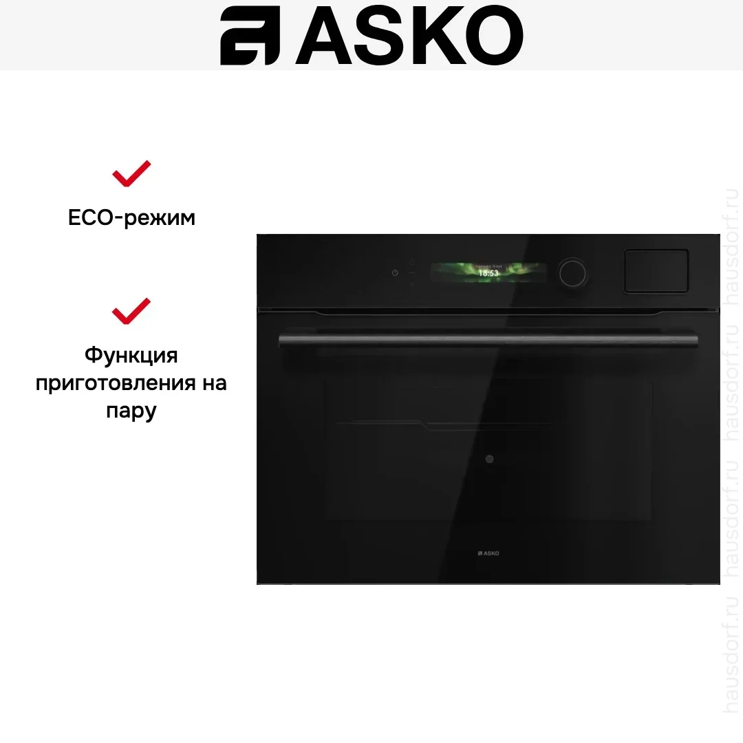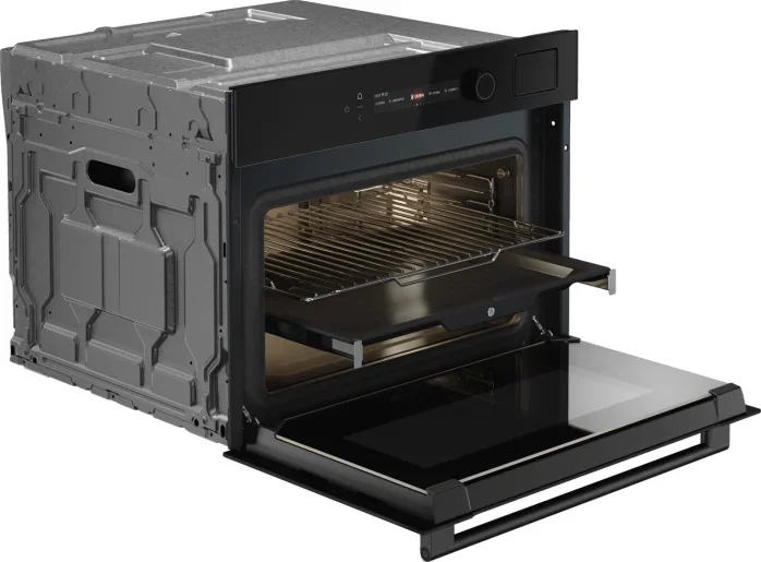 Компактный духовой шкаф ASKO OCS54BGH — стильный встраиваемый электрический прибор, который сочетает современный дизайн NYACraft Glass Series 5 с продуманной эргономикой и широким набором профессиональных функций. Аппарат с черным стеклом и откидной дверцей оснащен ручкой с фирменным логотипом и четырехслойным стеклопакетом UltraCoolDoorQuadro+, что обеспечивает безопасную эксплуатацию за счет холодной поверхности при интенсивном нагреве. Внутренняя камера объемом 51 литр покрыта пиролитической эмалью для удобной очистки, а галогенное освещение гарантирует отличную видимость готовых блюд на всех трех уровнях. Габариты 45.8×59.4×56.4 см и рекомендации по встраиванию 45—45.5×56×55 см делают прибор идеальным решением для компактной кухни, где важны и вместительность, и экономия места. Управление реализовано через цветной TFT-дисплей с сенсорными кнопками и поворотными регуляторами с подсветкой, поддерживается подключение к мобильному приложению ConnectLife.TRIR; диапазон регулировки температуры 30-250 °C, питание 220-240 В, частота 50-60 Гц. Продуктивность и удобство гарантируют 10 основных режимов работы и 123 автоматические программы, включая классический верхний/нижний нагрев, только нижний элемент, конвекцию, режим консервирования и автоматический шеф-режим. Широкий набор опций для работы с паром включает три программы паровой обработки, ступенчатое приготовление и комбинированные циклы (нагрев снизу + сверху + пар, вентиляционный нагрев + пар, нагрев сверху + снизу + вентилятор + пар), а также функция 100% пара, интенсивный, нормальный и малый пар для точного контроля текстуры и сочности. Гриль электрический большой площади дает возможность получить хрустящую корочку, в том числе в сочетании с обдувом, а аэрогриль/аэрофритюр расширяет гастрономические возможности. Среди полезных сервисных режимов — быстрый разогрев, поддержание температуры блюд, разогрев и стерилизация, режим ECO и шаббат, плюс калибровка термопоказателей для стабильного результата. Устройство комплектуется телескопическими направляющими (1-уровневыми), решеткой, термощупом и двумя противнями; наличие трех уровней для противней и навесных съемных телескопических направляющих обеспечивает безопасную загрузку и удобство в процессе готовки. Для паровых операций предусмотрен съемный резервуар объемом 1,2 л, а режим паровой очистки упрощает уход за камерой. Энергоэффективность класса A++ вместе с максимальной температурой 250 °C и массой 34,8 кг делают этот агрегат экономичным и устойчивым решением на каждый день; длина сетевого кабеля 200 см упрощает подключение на кухне. Артикул 744546 подтверждает комплектность и сервисную идентификацию модели.