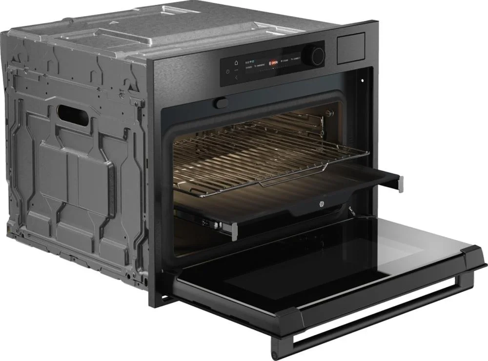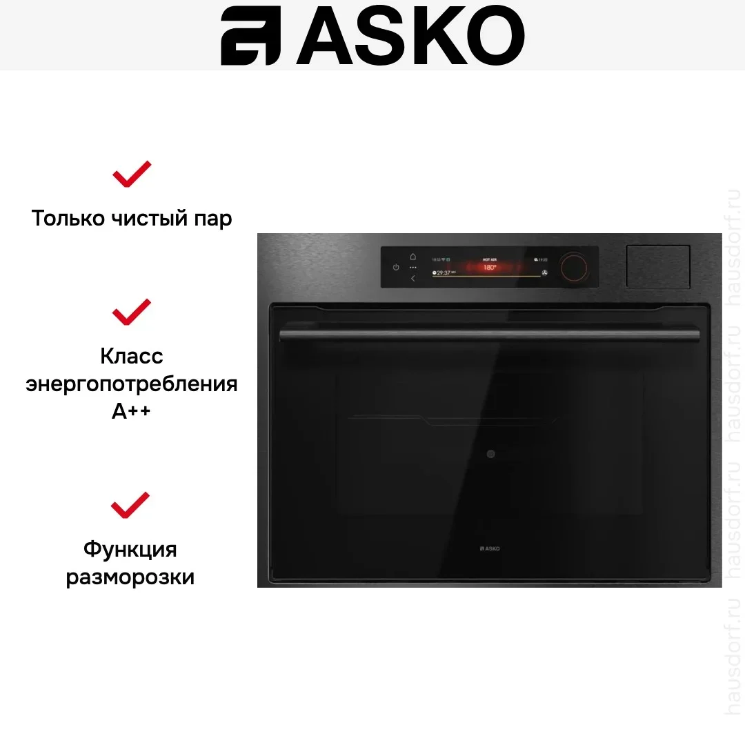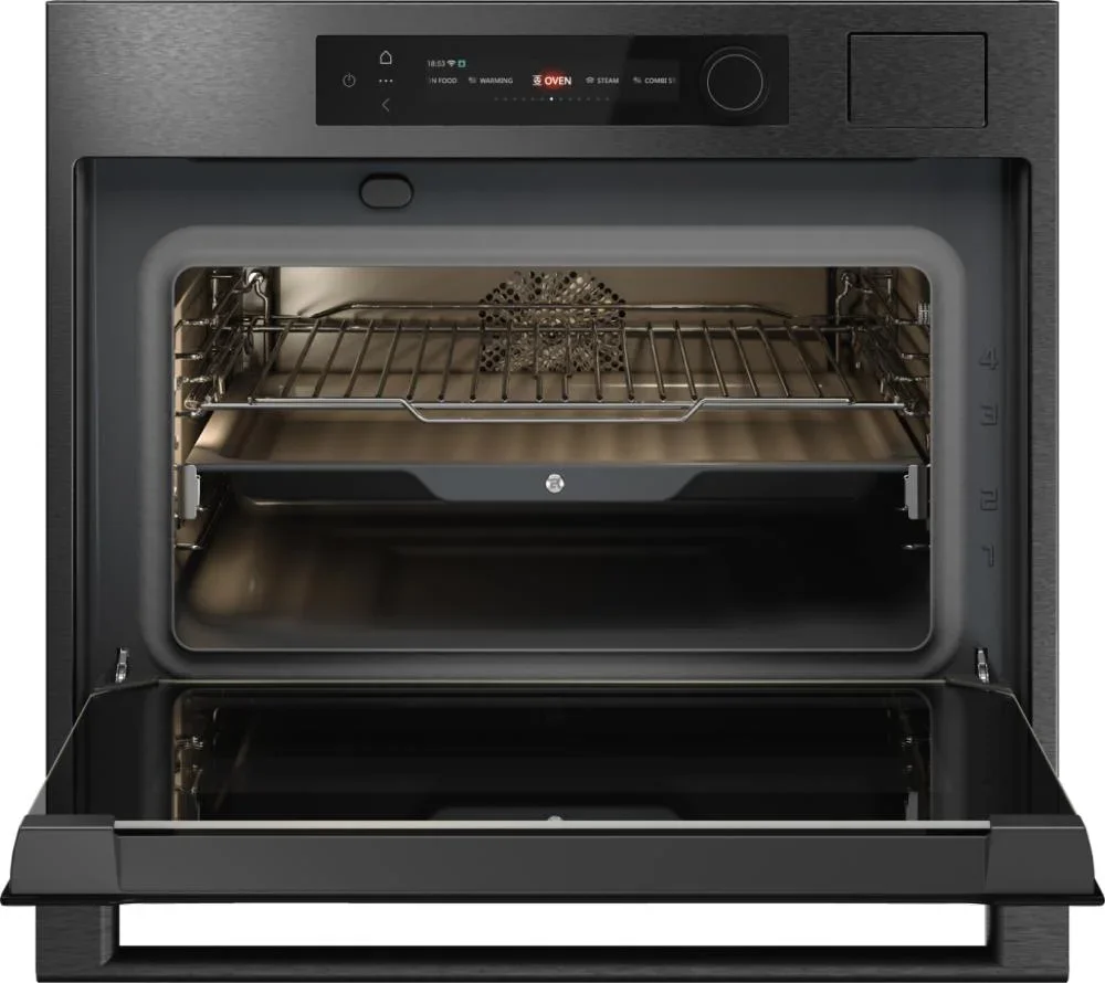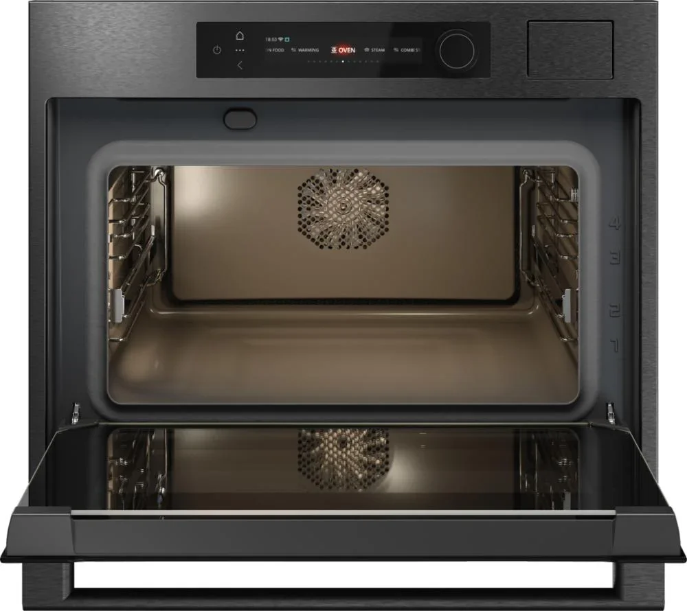 Компактный духовой шкаф ASKO OCS64BSH представляет собой гармоничное сочетание стильного оформления и продуманной функциональности, созданное для тех, кто ценит минимализм и профессиональные результаты при ограниченном пространстве. Корпус в оттенке черной стали и аккуратная рамка NYACraft Frame Series 6 формируют строгий, современный образ, который легко впишется в интерьер любой кухни, при этом передняя панель оснащена откидной дверцей с четырехслойным стеклопакетом, обеспечивающим надежную теплоизоляцию и безопасное использование. Внутреннее пространство обработано стойкой эмалью и вмещает 51 литр, что делает прибор универсальным решением для небольших семей или для дополнительной рабочей зоны; четыре уровня монтажа противней дают свободу при размещении нескольких блюд одновременно, а комплект поставки включает решетку, два противня, термощуп и однолинейные телескопические направляющие, облегчающие извлечение горячих поддонов. Панель управления объединяет сенсорные кнопки TouchControl и поворотные регуляторы с подсветкой, а цветной TFT-дисплей гарантирует удобный выбор параметров и наглядное отображение режимов; управление также доступно через приложение ConnectLife.TRIR, что делает эксплуатацию более гибкой и современной. Среди рабочих режимов — классический верхний и нижний нагрев, изолированный нижний обогрев, и эффективная конвекция, дополняемая функцией аэрогриля и крупной электрической решеткой для равномерного подрумянивания. Паровые программы представлены шестью алгоритмами и возможностью комбинирования горячего воздуха с паром либо верхнего и нижнего нагрева с вентилятором и влажной обработкой, что расширяет кулинарные горизонты: стерилизация, размораживание, медленное сохранение тепла для подачи, подогрев посуды и режим Шаббат. Интегрированный парогенератор Geyser Steam автоматически дозирует количество влаги в соответствии с рецептурой, резервуар на 1,2 литра позволяет готовить серию фирменных блюд без постоянной доливки, а функция «100% пар» и опция комбинированного приготовления с паром обеспечивают мягкую текстуру и сохранение полезных веществ. Для экономного и экологичного использования предусмотрены ECO-режим и класс энергопотребления A++, быстрый разогрев снижает ожидание, а диапазон температур от 30 до 250 °C покрывает все потребности от низкотемпературной томки до интенсивного запекания. Освещение с регулируемой яркостью и цветовой температурой сделано светодиодным и помогает контролировать готовность, а наличие четырехстеклянной дверцы, защиты от детей и возможности уменьшения влажности увеличивают комфорт и безопасность. Гриль большого формата и дополнительные опции типа аэрогриля/аэрофритюр пригодятся для приготовления золотистых корочек без лишнего жира, высокая универсальность поддерживается программой «Шеф» и автоматическими шагами, позволяющими следовать пошаговым алгоритмам. Компактность изделия с габаритами 45×59×56 см и нишей для встраивания 45×56×55 см экономит место, а при транспортировке учитывается размер упаковки 52×64×70 см и длина шнура 200 см. Тщательно продуманная эргономика, удобный хват ручки с логотипом и практичная внутренняя конфигурация делают агрегат удобным в ежедневном пользовании, а наличие регуляторов, дисплея и расширенного набора программ гарантирует, что даже при огра