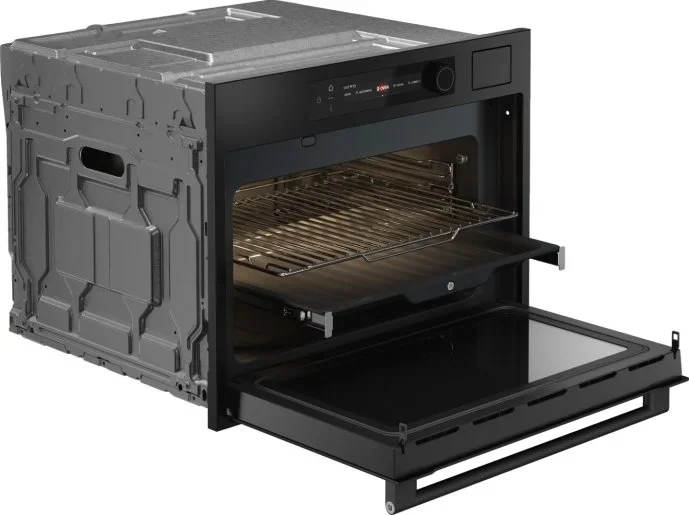 Компактный духовой шкаф ASKO OCSM64GSH — это сочетание продуманного дизайна NYACraft Frame Series 6 в графитовом исполнении и богатого функционала, упакованного в корпус высотой 45.8 см, шириной 59.7 см и глубиной 56.4 см, что делает прибор идеальным решением для встроенной небольшой ниши 45—45.5×56×55 см. Вдохновляющий внешний вид дополняют четырехслойная холодная дверца с фирменной ручкой и аккуратная текстовая панель управления с сенсорными кнопками и поворотными регуляторами с подсветкой, позволяющие легко выбирать нужные параметры. Объем камеры 50 л и четыре уровня приготовления дают простор для многокомпонентных блюд, а эмалированное покрытие упрощает уход; традиционная очистка дополняется функцией удаления накипи для поддержания работоспособности парового модуля. Встроенный парогенератор Geyser Steam формирует оптимальный объем влажности для разных рецептов, обеспечивая полноценное приготовление на 100% пару и расширяя возможности сочного и нежного результата; резервуар объемом 1.2 л удобен в обслуживании. Многообразие режимов — 28 рабочих вариантов и 143 автоматические программы — включает классический верхний/нижний нагрев, отдельный нижний нагрев, конвекцию, консервирование, высушивание, автоматический шеф‑режим и комбинированные методики с паром: горячий воздух+пар, нагрев сверху+снизу+вентилятор+пар, большой гриль с вентилятором, а также специальные программы СВЧ и паровые циклы (по 4 варианта каждого типа), что делает прогнозируемым успех в приготовлении разных кухонь. Наличие функции СВЧ мощностью 1000 Вт и опции Stirrer для микроволнового нагрева без поворотного стола существенно расширяют сценарии использования, а режимы аэрогриля/аэрофритюра и 360°AirFlow гарантируют равномерную корочку и хрустящую текстуру. Для практичности предусмотрены телескопические направляющие (однорівневые) и съемные навесные рейки на четырех позициях, комплект из решетки, двух противней и термощупа позволяет контролировать степень прожарки. Светодиодное освещение камеры с регулировкой яркости и цветовой температуры обеспечивает удобный визуальный контроль, а текстовый дисплей и поддержка приложения ConnectLife.TRIR расширяют возможности дистанционного управления. Прибор рассчитан на стандартное напряжение 220-240 В и частоту 50-60 Гц, оснащен длиной сетевого кабеля 200 см и системой защиты от детей, что повышает безопасность эксплуатации. Эта компактная модель сочетает в себе эстетику и инженерные решения для тех, кто ценит продуманную эргономику, широкий функционал и надежность в ограниченном пространстве.