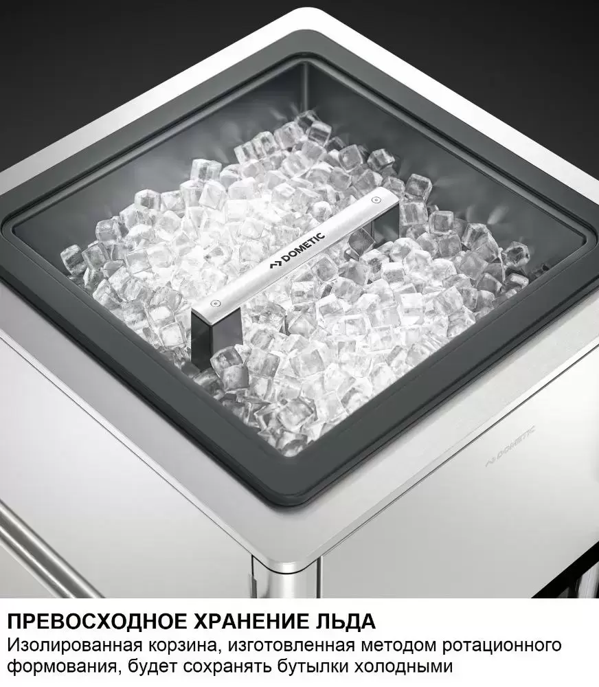 Основная камера рассчитана на 19 стандартных винных бутылок 0,75 л, а также может вместить до 70 жестяных банок. Дополнительное отделение чуть меньше — в него помещаются 32 банки или 22 бутылки (не для вина). Изолированная камера для льда — спасение в летнюю жару, так как под рукой всегда есть, чем охладить напитки.