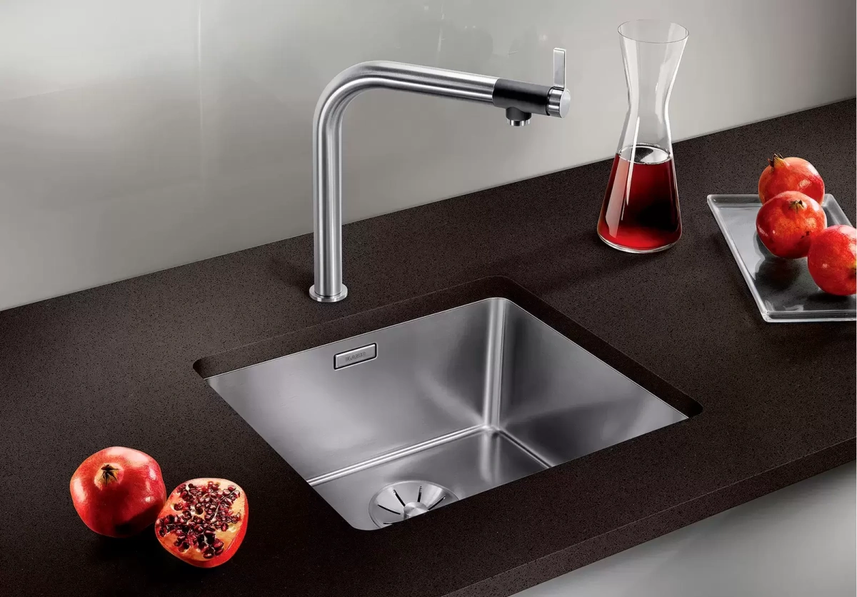 Модель устанавливается под столешницу — такая установка способствует сохранению герметичности и препятствует попаданию воды на мебель. Ширина 49 см и глубина 44 см позволяют устанавливать ее в стандартную столешницу шириной 60 см. Высококачественная сталь Premium 18/10 имеет толщину 0,9 мм, которая максимально гасит звук падающей в чашу воды. На нержавеющей стали не остается пятен, она устойчива к механическим повреждениям и высоким температурам. Глубина чаши составляет 19 см — в ней свободно поместится высокая посуда, например, вазы, и не возникнет затруднения с обработкой продуктов большого размера. Полированная сталь легко чистится, а в идеально скругленных углах чаши радиусом 2,2 см не будет накапливаться грязь. Блестящая полированная нержавейка превосходно гармонирует с интерьерами кухни в современном стиле. Для мойки предлагается большой набор дополнительных аксессуаров: разделочные доски из стекла и из натурального дерева, сетчатые корзины, коландеры и решетки из стали.