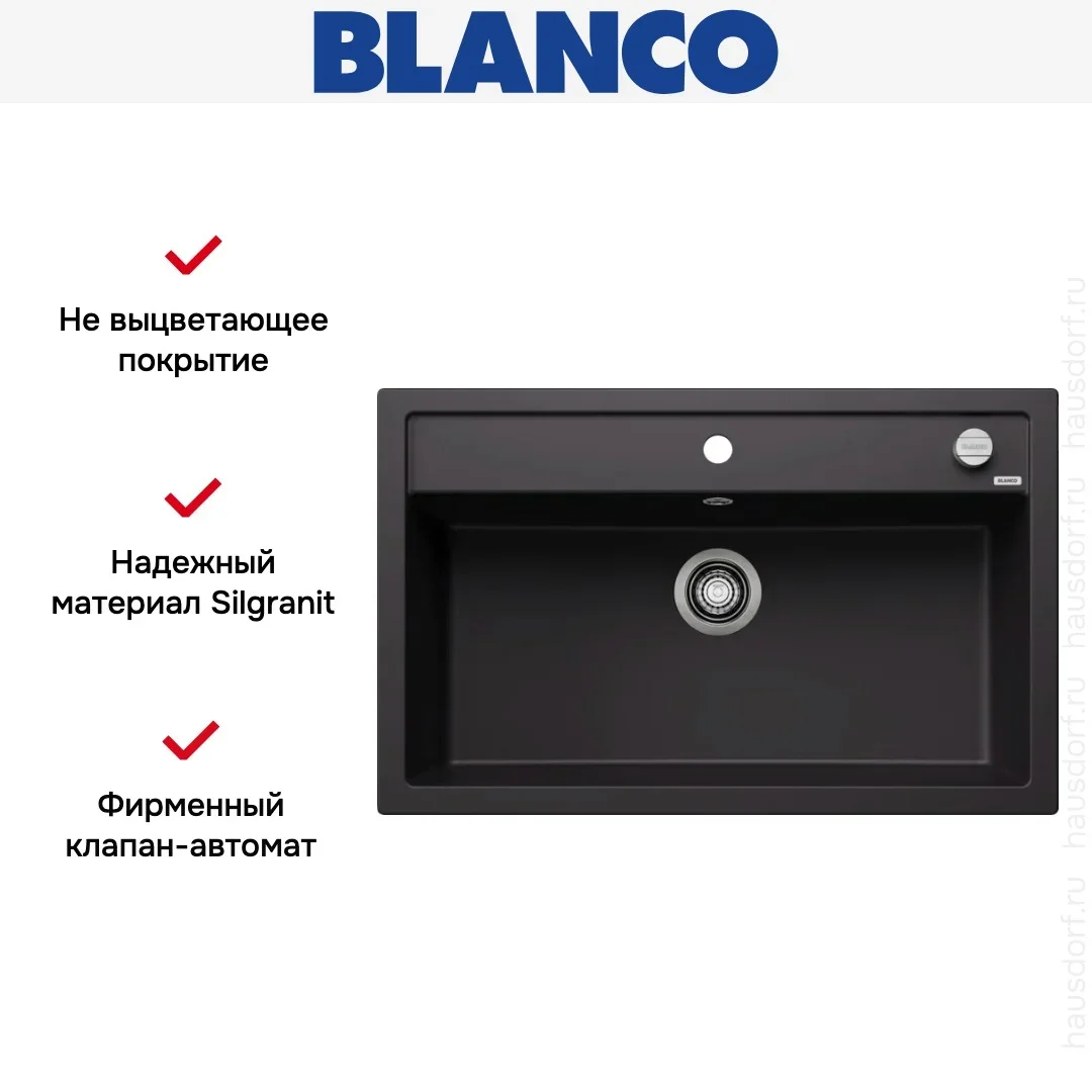 Мойка Blanco Dalago 8 — элегантная накладная модель из чёрного Silgranit, которая станет стильным центром рабочей зоны современной кухни. Прямоугольная форма и аккуратные геометрические линии делают её универсальным решением для интерьеров в минималистичном и индустриальном стилях. Габариты 81,5×51 см позволяют разместить изделие на стандартной столешнице, сохраняя пропорции и визуальную лёгкость рабочего пространства.