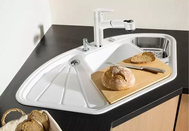Модель DELTA сочетает функциональность и эстетику угловой мойки. Основная чаша имеет трапециевидную форму. Крыло немного углублено, что позволяет использовать его в качестве дополнительной рабочей зоной. Коландер из нержавеющей стали повторяет форму чаши и служит для мытья и сушки овощей и фруктов. Рельефное крыло оборудовано дополнительным сливом для эффективного удаления излишков жидкости. Закругленные углы упрощают очистку труднодоступных мест.