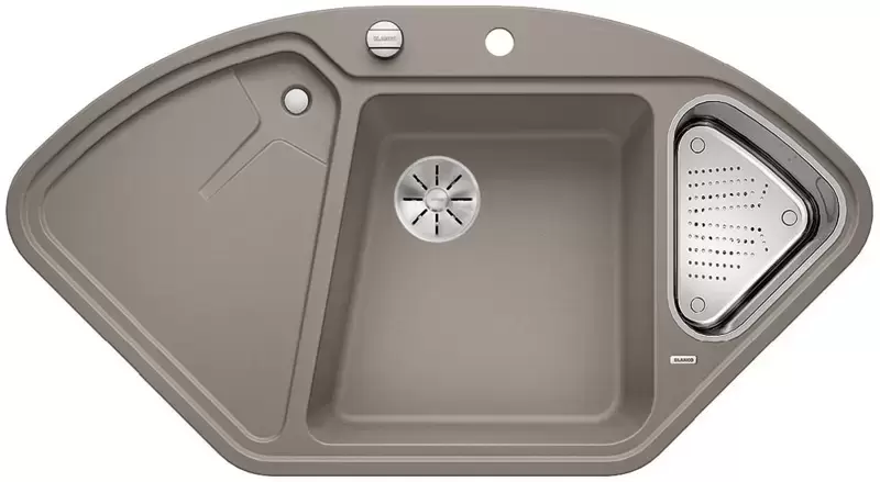Blanco DELTA II SILGRANIT — практичная угловая мойка из силгранита. Просторное крыло с углубленным донцем может использоваться для высушивания тарелок, а также ополаскивания фруктов, овощей и зелени. Дополнительная чаша модели укомплектована перфорированным коландером из нержавеющей стали.