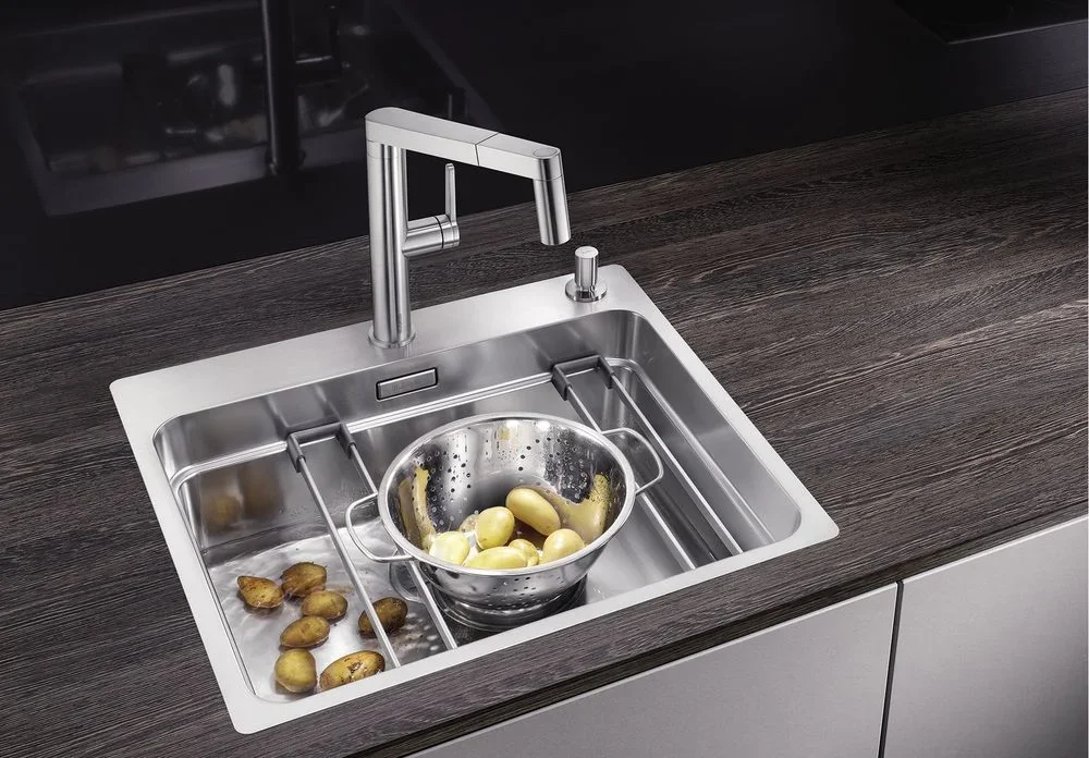 Врезная мойка Blanco — отличный выбор для тех, кто хочет создать гармоничное кухонное пространство с полностью вписывающейся в него сантехникой. Преимущество такой конструкции — плотное прилегание к столешнице, так как вырез подбирается индивидуально под габариты модели. Под стыки не попадает вода, поэтому срок службы значительно увеличивается, пользоваться ей удобно и приятно. Данная модель имеет стандартную форму, поэтому подходит большинству пользователей. Устанавливается вровень со столешницей, благодаря чему не остается стыков, в которых копились бы загрязнения. Устанавливается над столешницей: это самый простой способ монтажа, зачастую с ним можно справиться даже без специалистов, главное — правильно рассчитать размеры ниши.