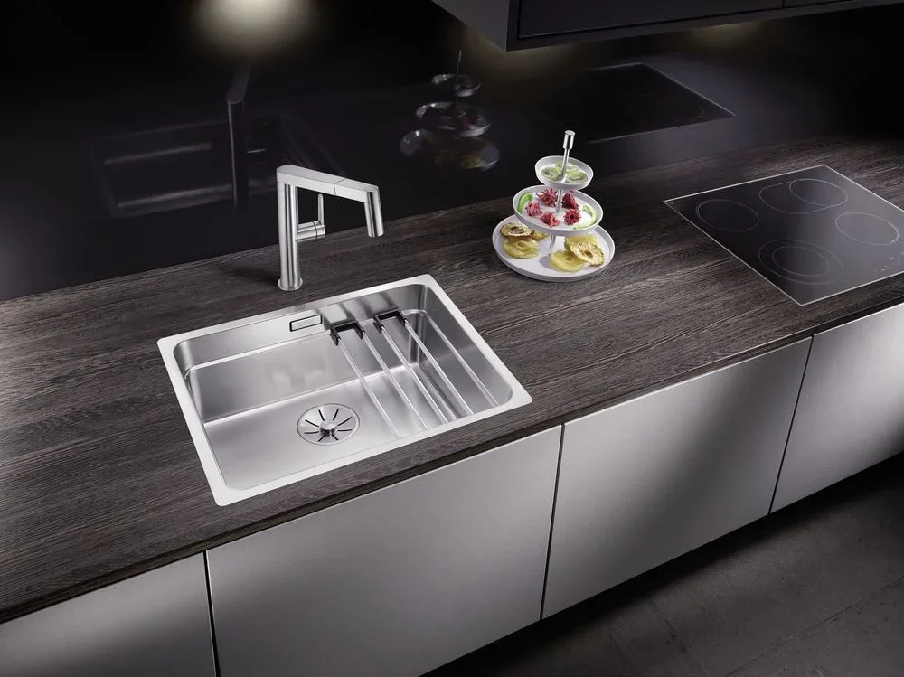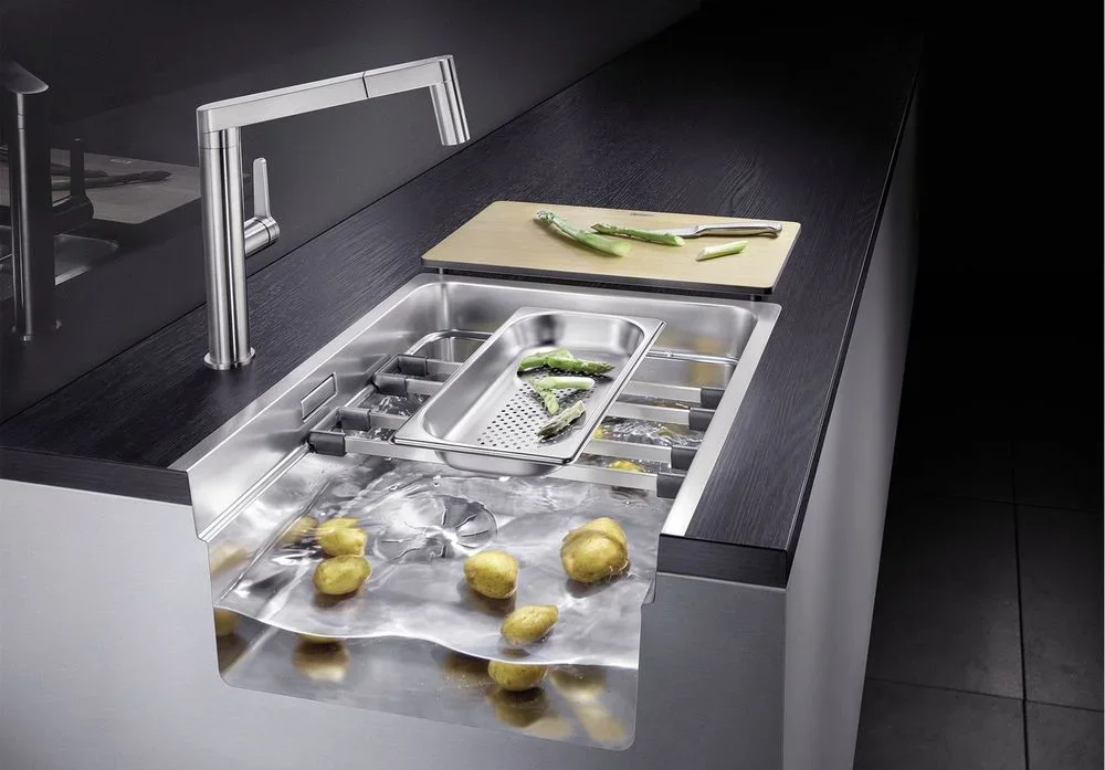 Продуманная система с универсальными направляющими расширяет функциональность. По направляющим можно устанавливать разделочную доску, пластиковый дуршлаг или металлические решетки. Такие аксессуары превращают чашу в рабочую платформу и ускоряют подготовку ингредиентов. Универсальные направляющие повышают эргономику без дополнительных доработок столешницы.