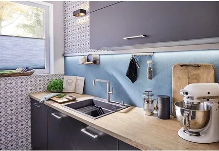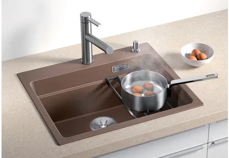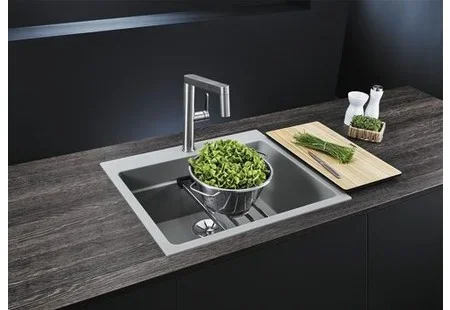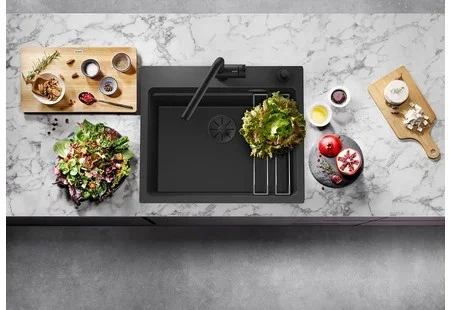 Мойка Blanco Etagon 6 — накладная прямоугольная модель размером 60×51 см оттенка «Антрацит». Компактные габариты делают её универсальной для типовой кухни с тумбой 60 см, а чёткие линии хорошо впишутся в интерьер современной кухни. Поверхность обладает глубокой, насыщенной текстурой цвета, которая маскирует мелкие следы использования и придаёт обстановке благородный вид.