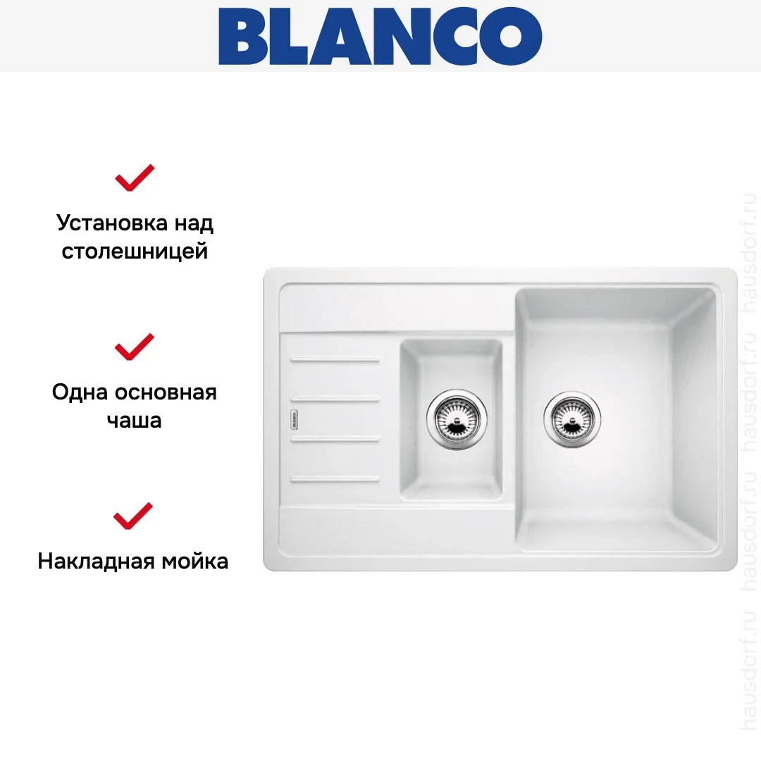 Накладная мойка Blanco — отличный выбор для тех, кто хочет создать гармоничное пространство с удобной сантехникой. простой в установке. Преимущество такой конструкции: легко подобрать практически к любой кухне и не придется демонтировать вместе с тумбой при ремонте или перестановке остальной мебели. Данная модель имеет стандартную форму, поэтому подходит большинству пользователей. Устанавливается над столешницей: это самый простой способ монтажа, зачастую с ним можно справиться даже без специалистов, главное — правильно рассчитать размеры ниши.