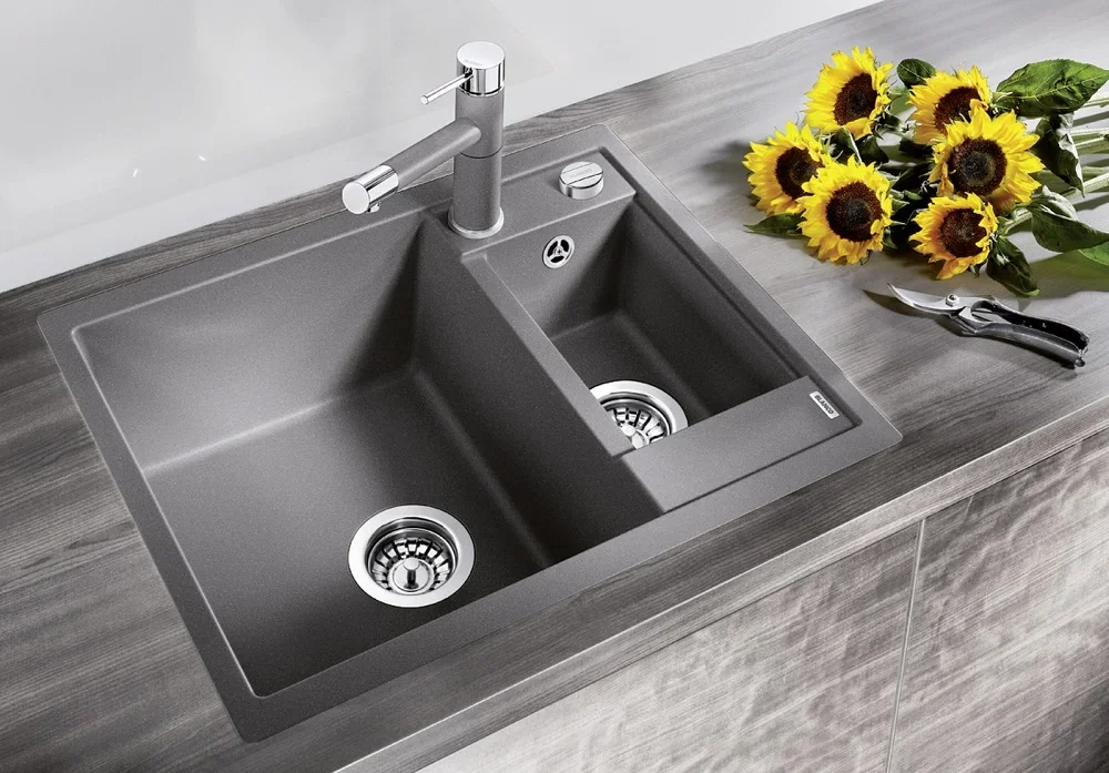 Материал Silgranit сочетает прочность натурального камня и практичность композита. Поверхность устойчива к ударам, царапинам и воздействию обычных кухонных средств, при этом не пористая, что снижает риск впитывания пятен и появления неприятных запахов. Черное покрытие долго сохраняет насыщенность при соблюдении простых правил ухода: мягкие неабразивные спонжи и щадки моющие средства без агрессивных кислот. Стандартный диаметр сливного отверстия 3,5″ совместим с большинством сифонов и аксессуаров.