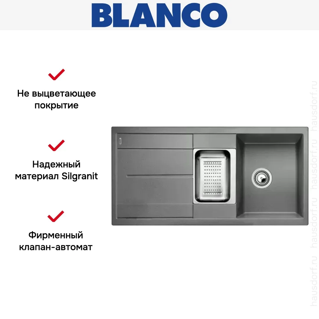 Оборачиваемая модель оборудована дополнительной чашей и коландером из нержавеющей стали. Аксессуар повторяет форму чаши и необходим для мытья столовых приборов или фруктов. Излишки воды стекают через специальные отверстия. В комплект входят также отводная арматура с клапаном-автоматом для основной чаши, позволяющая удобно сливать воду, и корзинчатый вентиль для дополнительной чаши, предупреждающий появление засоров. Большое крыло — дополнительная рабочая зона. Материал Silgranit устойчив к появлению царапин и сколов, легко очищается и является безопасным для продуктов питания.