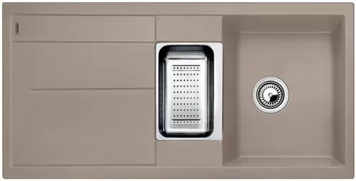 Оборачиваемая модель оборудована дополнительной чашей и коландером из нержавеющей стали. Аксессуар повторяет форму чаши и необходим для мытья столовых приборов или фруктов. Излишки воды стекают через специальные отверстия. В комплект входят также отводная арматура с клапаном-автоматом для основной чаши, позволяющая удобно сливать воду, и корзинчатый вентиль для дополнительной чаши, предупреждающий появление засоров. Большое крыло — дополнительная рабочая зона. Материал Silgranit устойчив к появлению царапин и сколов, легко очищается и является безопасным для продуктов питания.