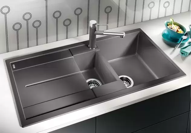 Оборачиваемая модель оборудована дополнительной чашей и коландером из нержавеющей стали. Аксессуар повторяет форму чаши и необходим для мытья столовых приборов или фруктов. Излишки воды стекают через специальные отверстия. В комплект входят также отводная арматура с клапаном-автоматом для основной чаши, позволяющая удобно сливать воду, и корзинчатый вентиль для дополнительной чаши, предупреждающий появление засоров. Большое крыло — дополнительная рабочая зона. Материал Silgranit устойчив к появлению царапин и сколов, легко очищается и является безопасным для продуктов питания.