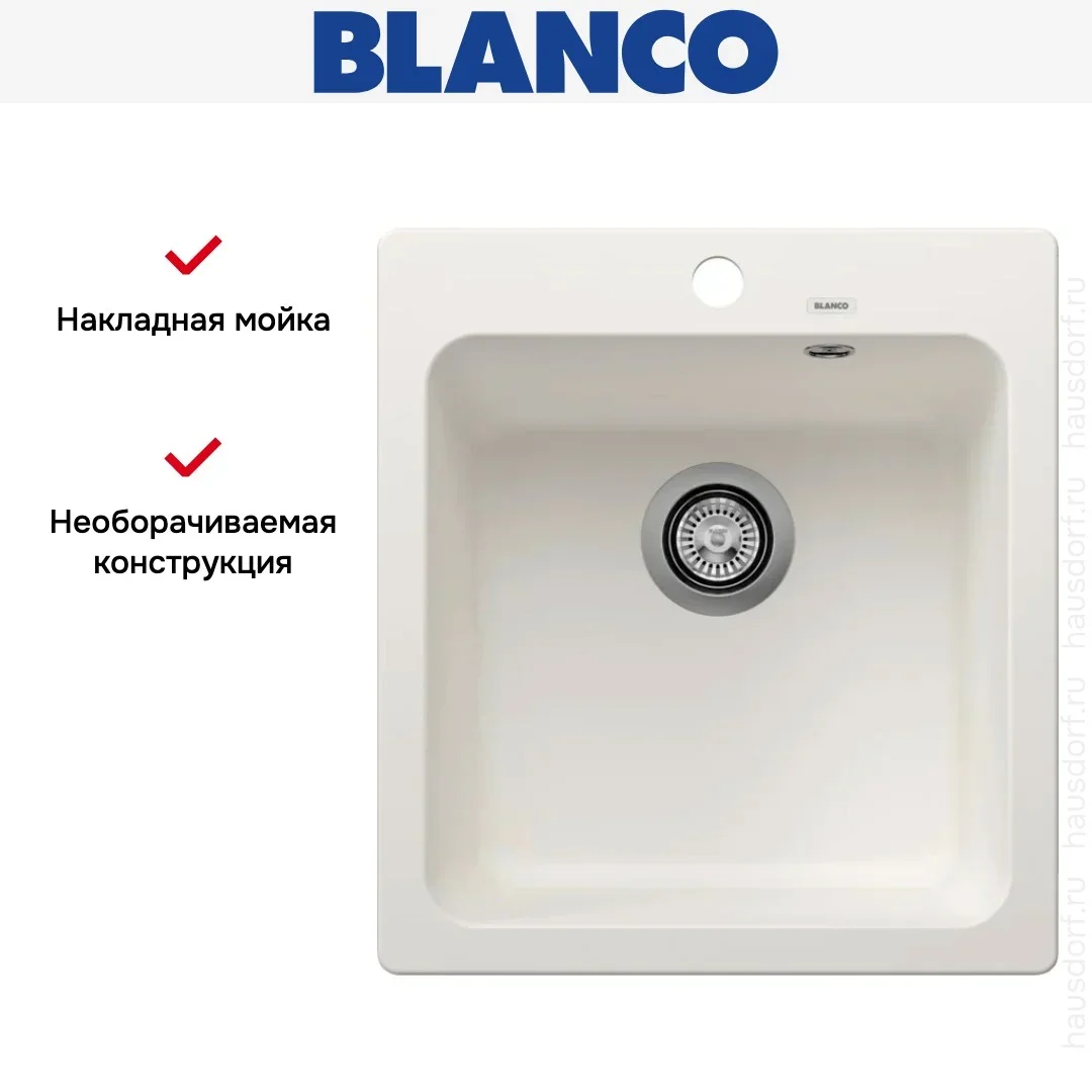Мойка Blanco Naya 45 — накладная прямоугольная модель в белом цвете, созданная для компактных кухонь и современных интерьеров. Ее аккуратные габариты 46.5×51 см делают изделие удобным решением для узких столешниц и баз шириной 45 см. Установка над столешницей с бортиком упрощает монтаж и обеспечивает дополнительную защиту от подтеков в местах стыка.