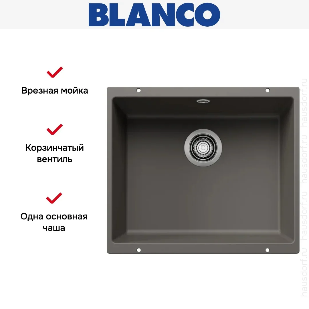 Мойка Blanco Rotan 500-U Silgranit — врезная прямоугольная модель для подстольной установки, выполненная в вулканическом сером цвете. Она рассчитана на шкаф шириной от 60 см и компактно укладывается на рабочую поверхность общей шириной 53 и глубиной 46 см. Монтажное отверстие 50×40 см облегчает точную установку и гарантирует плотную посадку без лишних зазоров. Конструкция не оборачиваемая, поэтому точное расположение сифона и смесителя нужно продумать заранее.