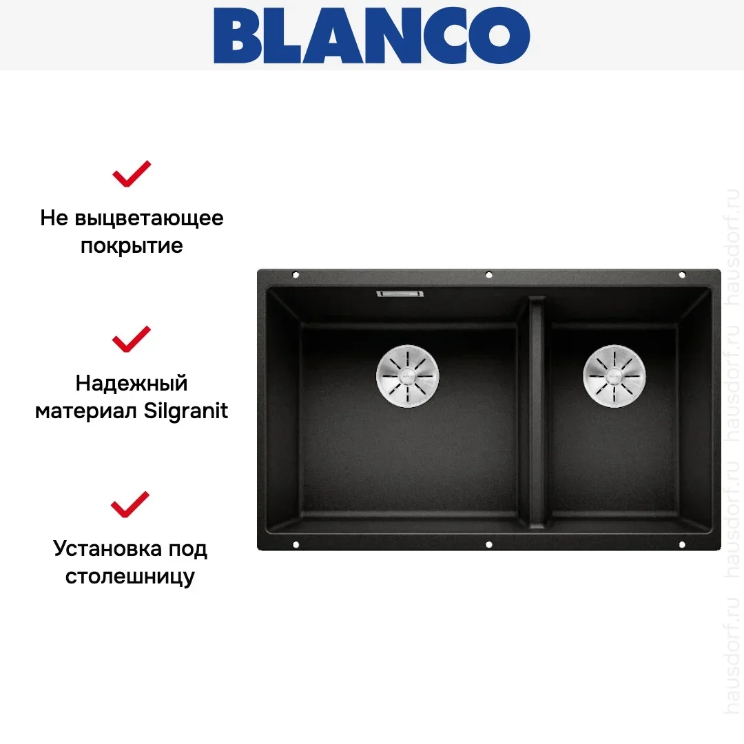 Мойка Blanco Subline 430/270 U с отводной арматурой InFino — элегантное решение в черном цвете для современного кухонного пространства. Дизайн выполнен в строгих прямых линиях, которые отлично сочетаются с минималистичными и классическими столешницами. Черный Silgranit придает изделию солидный внешний вид и позволяет ему стать выразительным акцентом интерьера. Прямоугольная форма и врезной способ установки под столешницу создают аккуратный бесшовный переход от поверхности к мойке.