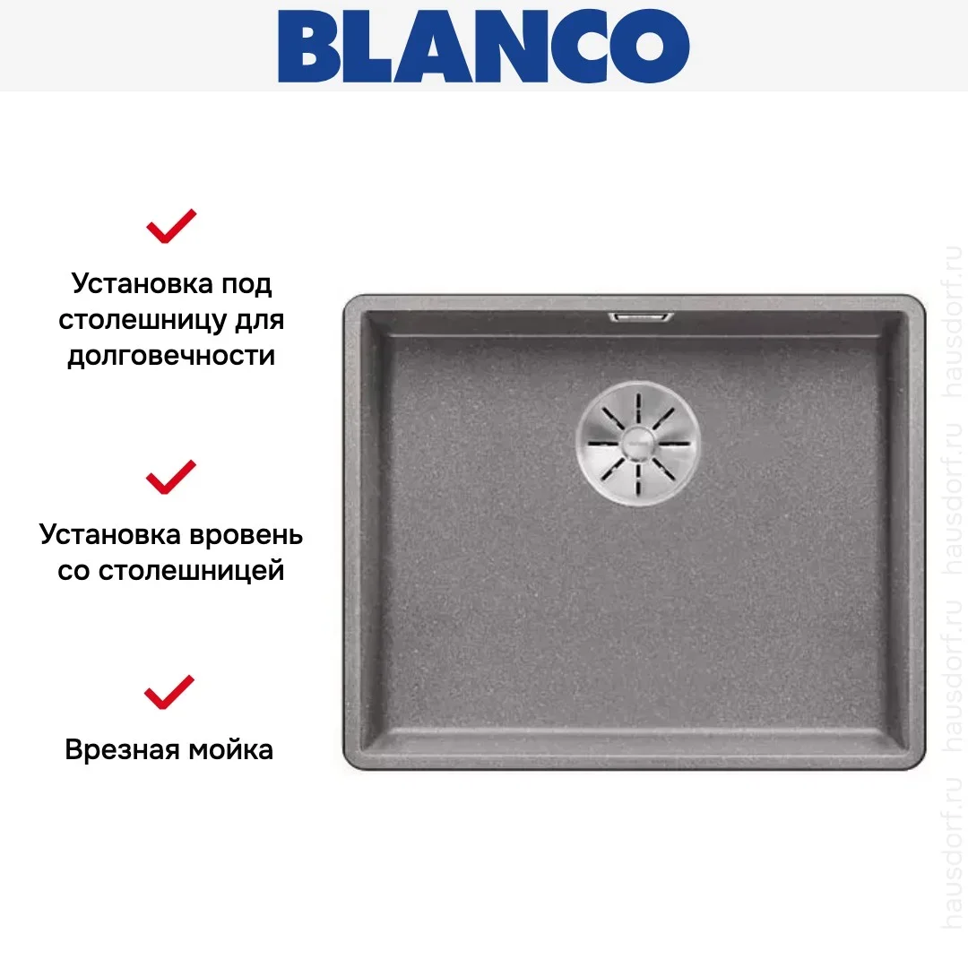 Blanco SUBLINE 500-F — врезная мойка, предназначенная для монтажа в один уровень со столешницей. Модель укомплектована отводной арматурой InFino® с корзинчатым вентилем. Для защиты от переполнения чаши предусмотрен скрытый перелив C-overflow®.