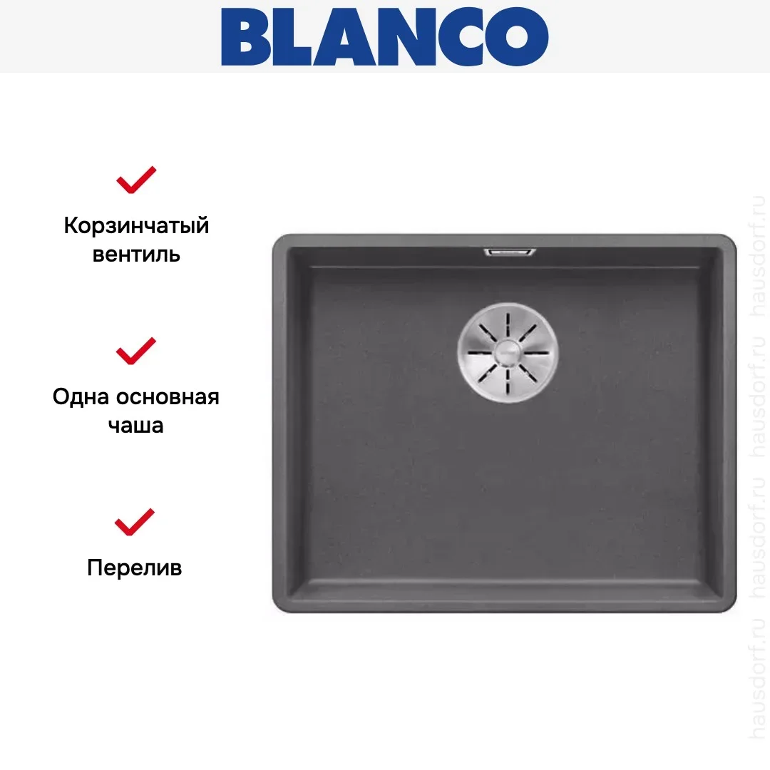 Blanco SUBLINE 500-F — врезная мойка, предназначенная для монтажа в один уровень со столешницей. Модель укомплектована отводной арматурой InFino® с корзинчатым вентилем. Для защиты от переполнения чаши предусмотрен скрытый перелив C-overflow®.