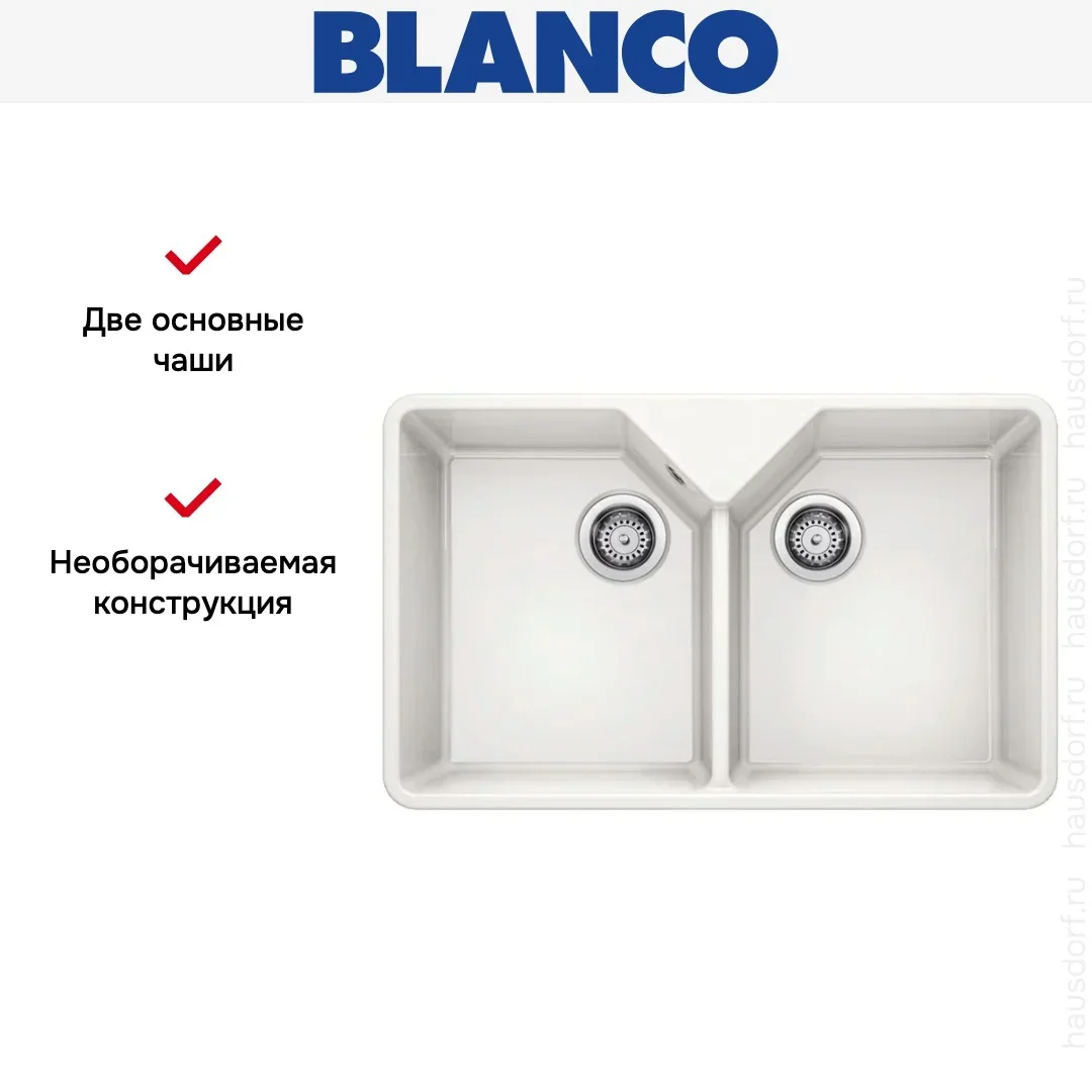 Мойка Blanco Villae Double глянцевый белый выполнена в модульном исполнении и привлекает лаконичными прямыми линиями. Компактные габариты 79,4×49 см делают изделие удобным для средних и больших кухонь. Подстольный монтаж обеспечивает бесшовный переход от столешницы к поверхности раковины и упрощает уборку. Непереворачиваемая конструкция требует точной ориентации при установке, что следует учесть на этапе планирования пространства.