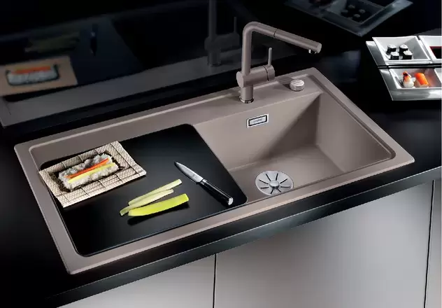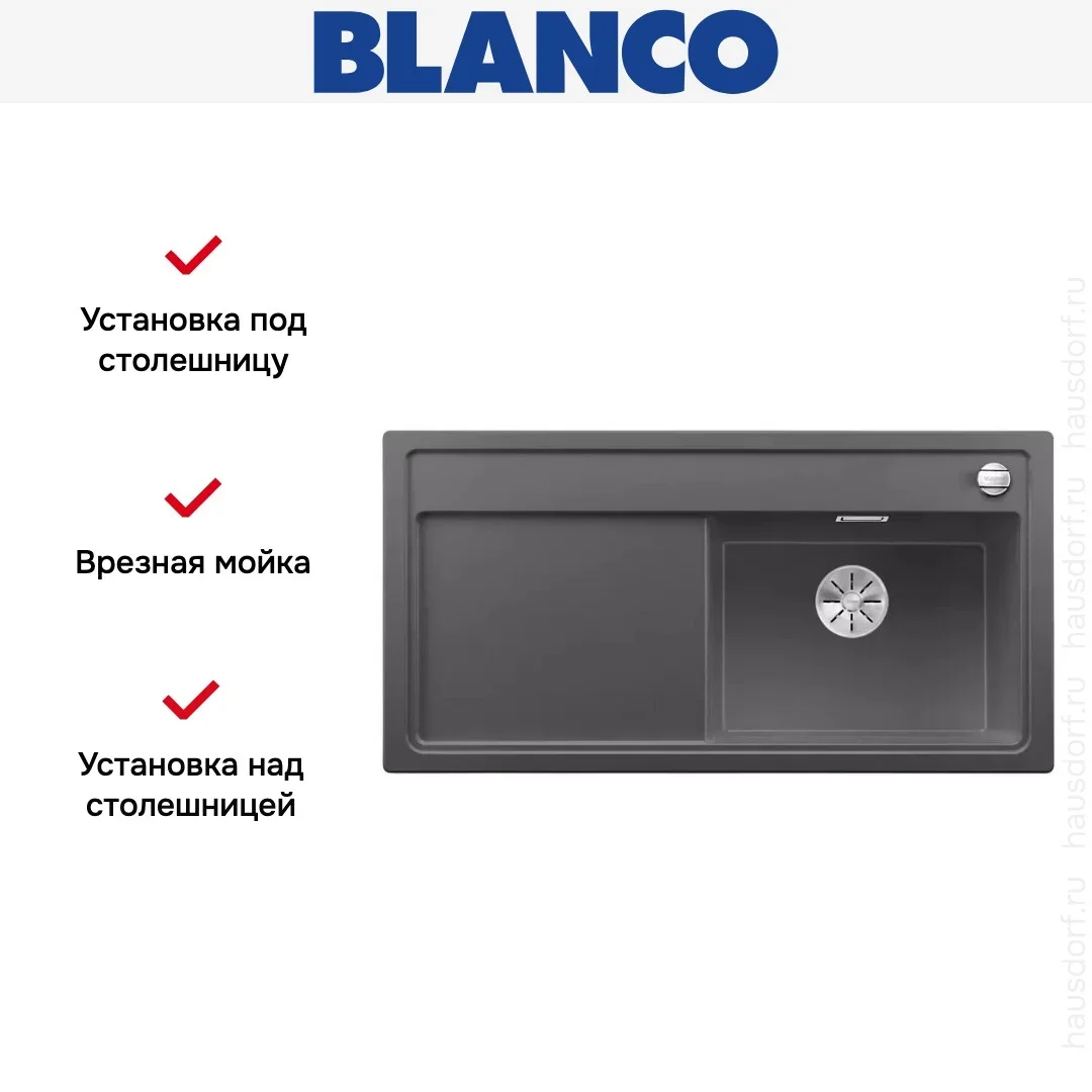 Blanco ZENAR XL 6 S — врезная гранитная мойка необорачиваемой конструкции. Модель оборудована вместительной чашей и просторным крылом для сушки посуды. В комплект поставки включены большая разделочная доска из черного безопасного стекла и отводная арматура InFino® с клапаном-автоматом 3 ½".