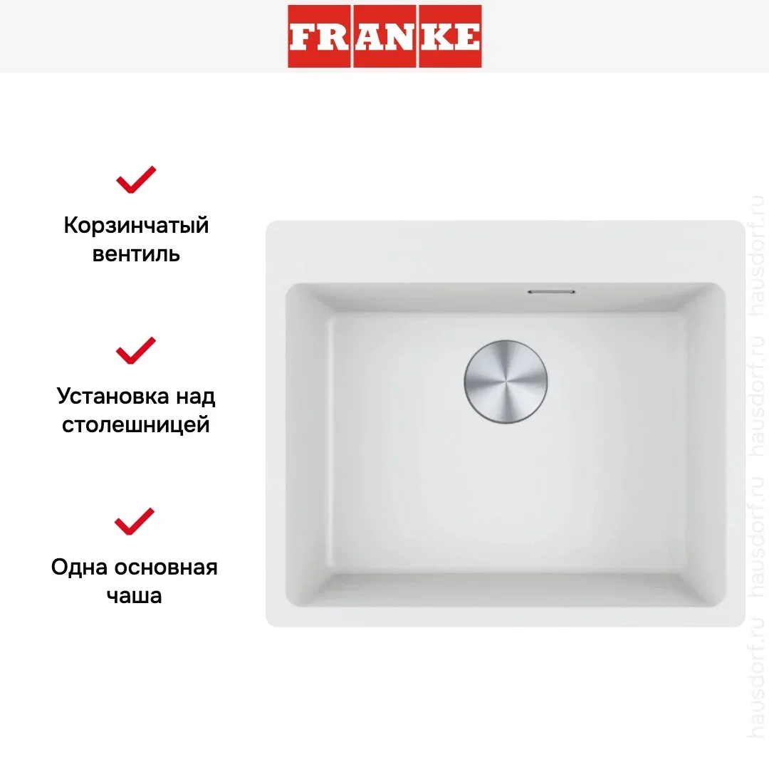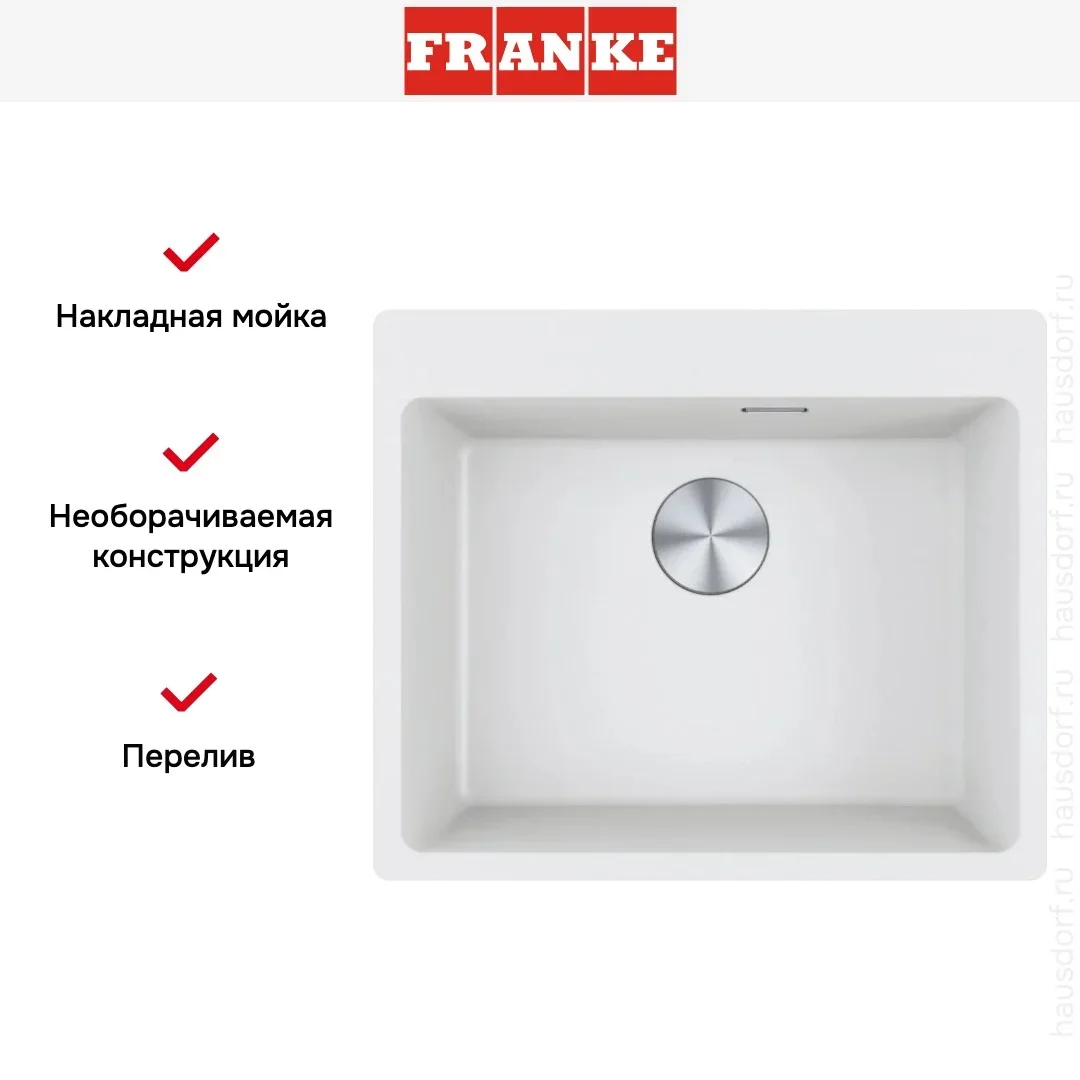 Мойка Franke MRG 610-54 FTL белоснежного цвета — это элегантное и функциональное решение для современной кухни. Модель выполнена в виде прямоугольной врезной чаши, устанавливаемой над столешницей, что обеспечивает простоту монтажа и эстетичный внешний вид. Её габариты составляют 59×50 см, что делает изделие оптимальным для стандартных кухонных модулей шириной 60 см. Для правильной установки необходимо подготовить монтажное отверстие размером 57×48 см, что гарантирует плотное прилегание и надёжную фиксацию.