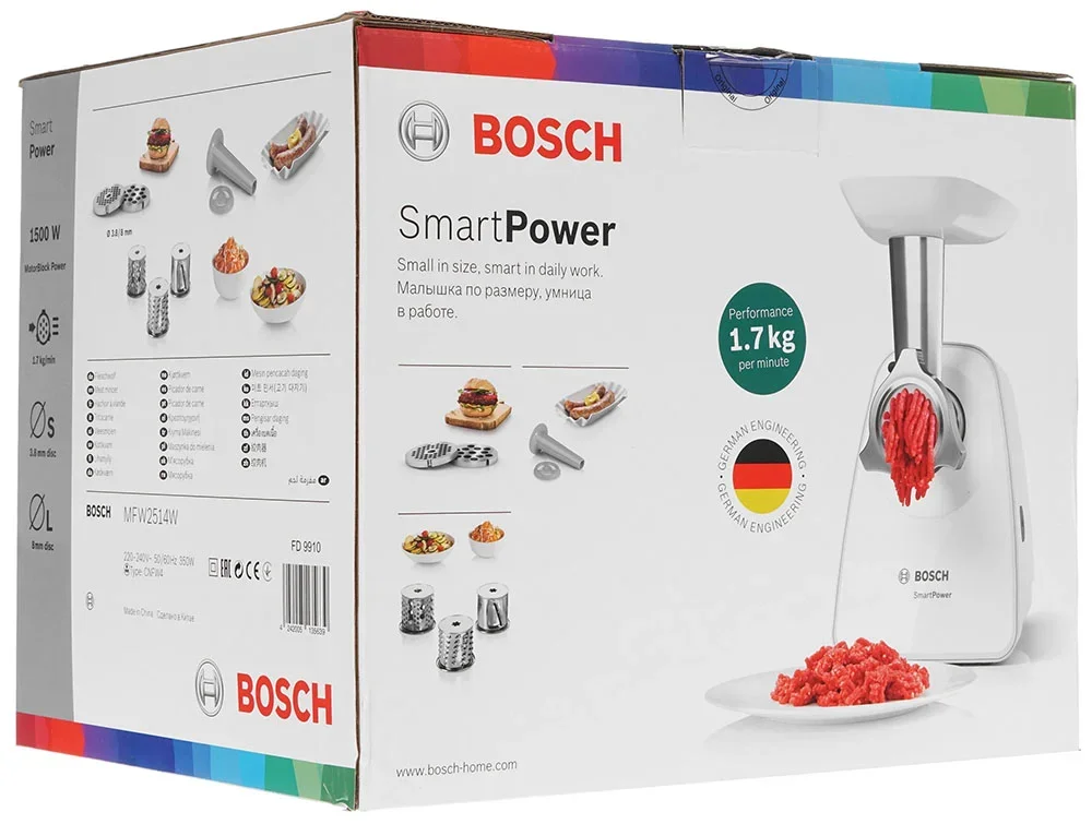 Мясорубка Bosch MFW2514W — это компактный и надёжный кухонный агрегат, разработанный для тех, кто ценит простоту, функциональность и аккуратный дизайн в повседневной готовке. Стационарная модель обеспечивает стабильную производительность на уровне 1,7 килограмма в минуту, что делает её отличным выбором для приготовления фарша, овощных смесей, начинок для пирогов или домашних колбасок в условиях небольшой семьи или дачной кухни.