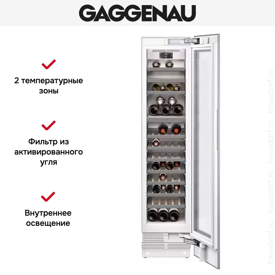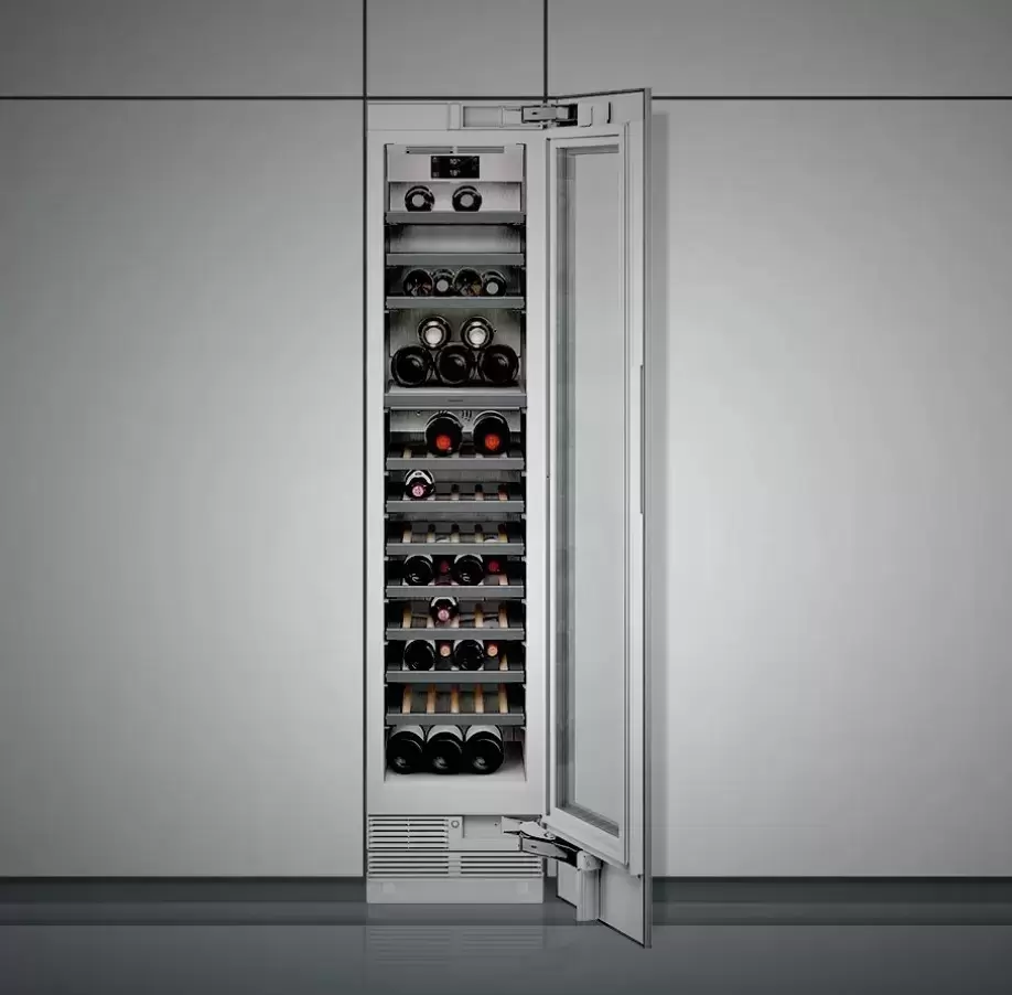 Полновстраиваемый винный шкаф Gaggenau RW414364 — узкая компрессорная модель из новейшей серии 400, оснащенная одной камерой с разделением на две зоны и поддержанием в них разной температуры. Такая компоновка позволяет хранить различные сорта вин, например, красные и белые. Шкаф предназначен для установки в мебельный гарнитур или колонну, его размеры составляют 45 см в ширину, 212 см в высоту и 60 см в глубину. Такие габариты позволяют разместить рядом другой модуль Гаггенау в конфигурации Side-by-Side. Дверь со стеклопакетом в стальной оправе защищает содержимое от вредного воздействия ультрафиолета. Автоматическая система разморозки с испарением талой воды гарантирует отсутствие инея и облегчает очистку.