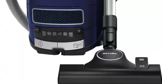 Напольный пылесос Miele имеет стандартную конфигурацию: вытянутый корпус на колесиках, телескопическую трубку и шланг, а также несколько насадок для разных поверхностей. Модель имеет необычный цвет — брендовый оттенок «морской синий», который делает ее также интересной деталью интерьера (если у вас нет специальной кладовки для хранения).