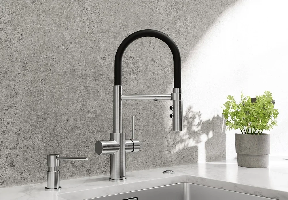 Смеситель Blanco Catris S Flexo Filter сочетает в себе лаконичный внешний вид и продуманные технические решения. Его оттенок нержавеющей стали придаёт кухне современный и нейтральный характер, который гармонирует с большинством рабочих поверхностей и бытовой техники. Корпус из латуни обеспечивает надёжность и стойкость к коррозии, а матовая или полированная поверхность легко очищается от отпечатков и водных следов. Однорычажная конструкция делает управление интуитивным и быстрым, что особенно ценно в условиях частого приготовления пищи.