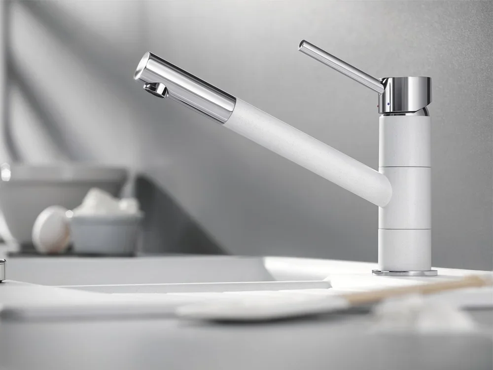 Смеситель Blanco Kano 525030 Silgranit белый выполнен в лаконичном стиле и сразу задает тон современной кухни с акцентом на практичность и эстетику. Его белая матовая поверхность плавно сочетается с хромированной вставкой, что придает прибору выразительность без лишней вычурности. Компактные формы и продуманная геометрия корпуса делают изделие универсальным для разных интерьеров, от минимализма до скандинавского стиля. Внешний вид ориентирован на тех, кто ценит чистые линии и легко поддерживаемую чистоту покрытия.