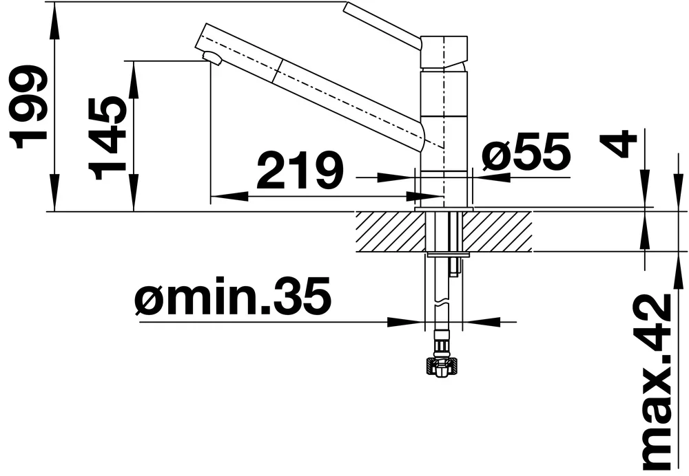 Высота излива 14,5 см и длина 21,9 см обеспечивают оптимальный вылет и клиренс над чашей, минимизируя разбрызгивание. Горизонтальный монтаж предусматривает одно монтажное отверстие диаметром 35 мм для аккуратной установки. В комплекте предусмотрена стабилизирующая пластина, которая распределяет нагрузку и исключает люфт на столешнице.