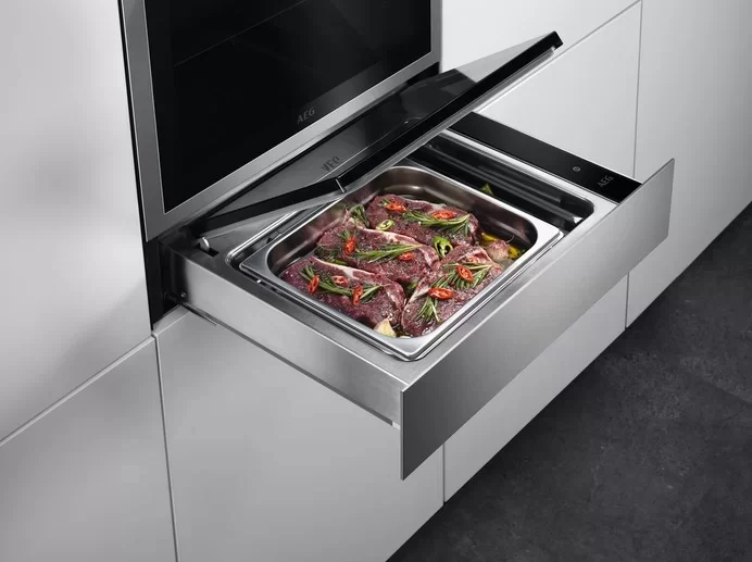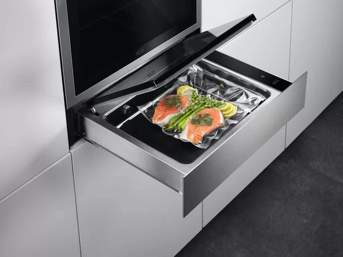 AEG KDE911423M — выдвижной ящик для вакуумной упаковки. Фронт модели выполнен из нержавеющей стали с покрытием AntiFingerPrint, защищающим внешнюю поверхность от следов отпечатков пальцев. Сенсорная панель управления и светодиодный дисплей повышают уровень комфорта и позволяют наиболее точно контролировать работу устройства.