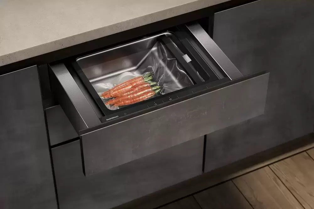 Вакуумный упаковщик Gaggenau DV061100 — встраиваемое устройство, предназначенное для герметичной упаковки продуктов в отсутствии воздуха и продлевающее срок их хранения. Новая серия 400, к которой относится модель, предлагает профессиональные решения для домашней техники. Все изделия рассчитаны на двадцатилетний срок службы, они изготавливаются на предприятии компании в Словакии. В отличие от большинства вакууматоров Гаггенау, на фронтальную часть этого устройства навешивается декоративный фасад: оно полностью интегрируется в интерьер и не выступает над уровнем мебели.