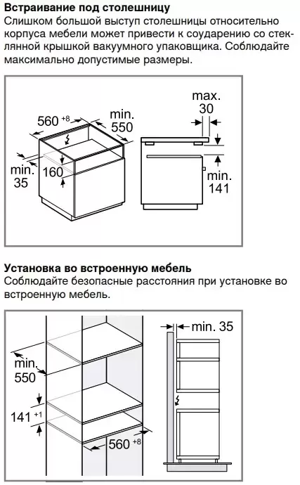 Высота 14 см, ширина 56 см и глубина 51 см позволяют установить прибор под столешницу или в колонну над духовкой или другой подобной техникой. Объем ящика равен 7 литров, максимальный вес загрузки достигает 10 кг. Материал изготовления внутренней камеры — нержавеющая сталь, не подверженная коррозии. При должном уходе на ней не остается царапин. В камеру помещается специальный пакет размерами не более 240×350 мм с мясом, рыбой, овощами, сыром, готовыми блюдами или полуфабрикатами. Воздух откачивается насосом, затем происходит запаивание с помощью нагретой планки с антипригарным покрытием. Предусмотрено три уровня вакуумирования в камере с удалением до 99% воздуха и еще три — для обработки вне камеры, с удалением 90% воздуха. Все настройки выбираются на сенсорной панели управления. В вакууме прекращается размножение бактерий, замедляются процессы окисления: продукты сохраняют первозданную свежесть и вкус.