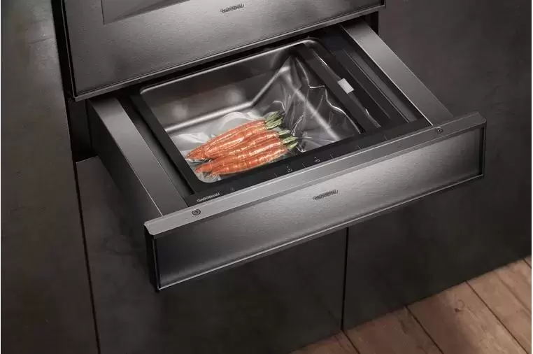 Вакуумный упаковщик Gaggenau DV461100 — многофункциональный прибор, для создания разреженной атмосферы в пакетах и контейнерах и улучшения качества хранения продуктов. Устройство встраивается в кухонный гарнитур под столешницу или в нишу и немного выступает над уровнем мебели. Фасад из стекла цвета антрацит не имеет ручки, ящик открывается нажатием на фронтальную часть. Габариты, соответствующие стандартам (ширина 59 см, глубина 51 см, высота 13,7 см) позволяют монтировать прибор в обычный гарнитур.
