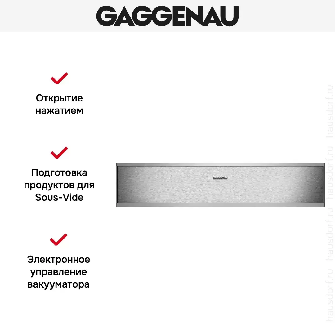 Вакуумный упаковщик Gaggenau DV461110 — встраиваемое устройство, способное увеличить срок годности продуктов и значительно улучшить качество хранения. Модель изготовлена на собственном заводе Гаггенау в Словакии. Она незаметна в интерьере: фасад из закаленного стекла цвета нержавеющей стали не имеет ручки, но внизу есть выемка, которая служит для открывания и закрывания. Встраиванию в нишу или в колонну с другой техникой способствуют стандартные габариты — ширина 59 см, глубина 51 см, высота 13,7 см. Камера объемом 7 литров с внутренней поверхностью из нержавеющей стали выдерживает нагрузку до 10 кг. Мощный насос быстро удаляет воздух из любых емкостей. Для запайки пакетов предназначается планка с антипригарным покрытием. Для дополнительной защиты служит стеклянная крышка, которая открывается после завершения процесса автоматически.