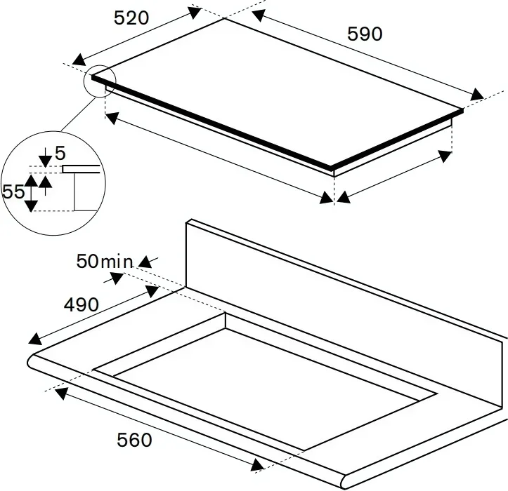 Ширина панели — 59 см, что соответствует стандартным размерам кухонных модулей, а для встраивания требуется ниша 56×49 см. Благодаря минимальной высоте корпуса — всего 6 см — устройство аккуратно встраивается в столешницу, не нарушая её линий. Индукционная технология обеспечивает мгновенный нагрев, высокую энергоэффективность и безопасность: тепло генерируется исключительно на дне совместимой посуды, в то время как поверхность вне зоны контакта остаётся относительно прохладной.
