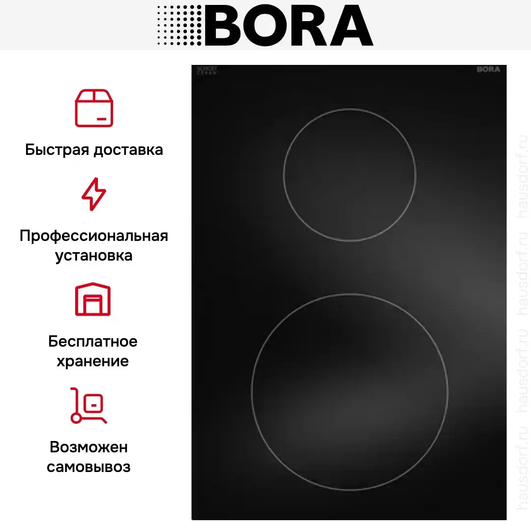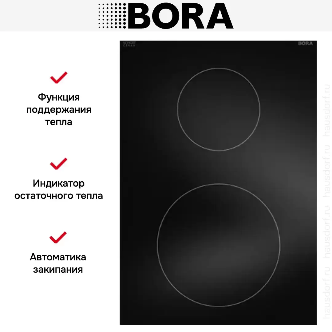 BORA PI110 — индукционная варочная панель с круглыми конфорками различного диаметра и уровня мощности. Модель поставляется с выносной панелью управления, оборудованной поворотными регуляторами. Функция поддержания тепла позволяет сохранить необходимую температуру блюда до подачи на стол. Для контроля приготовления предусмотрен цифровой индикатор ступени нагрева.
