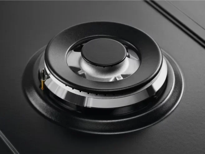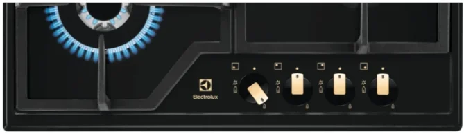 Варочная панель Electrolux EGS6436RK — это стильное и функциональное газовое устройство, сочетающее в себе классическую надёжность и современный дизайн. Модель выполнена в глубоком чёрном цвете с прямыми краями, что придаёт ей строгую элегантность и позволяет гармонично вписываться в различные кухонные интерьеры. Ярким акцентом выступает фурнитура медного цвета, добавляющая нотку роскоши и винтажного шарма, а массивные чугунные решётки подчёркивают практичность и долговечность конструкции.
