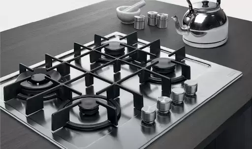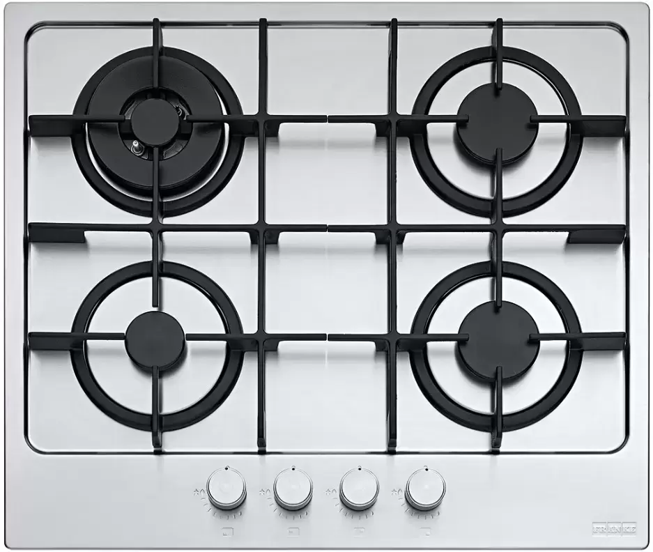 Выбор газовой варочной панели чаще всего обусловлен тем, что в частный дом или квартиру проведен именно газ в качестве обогрева. Работать с этой моделью довольно просто, так как мощность нагрева видна невооруженным взглядом — по силе огня в горелке. Количество конфорок в этой модели: 4. Горелки с двойной короной позволяют увеличивать мощность нагрева в зависимости от диаметра посуды.