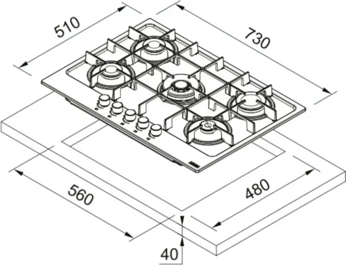 Выбор газовой варочной панели чаще всего обусловлен тем, что в частный дом или квартиру проведен именно газ в качестве обогрева. Работать с этой моделью довольно просто, так как мощность нагрева видна невооруженным взглядом — по силе огня в горелке. Количество конфорок в этой модели: 5. Горелки с двойной короной позволяют увеличивать мощность нагрева в зависимости от диаметра посуды.