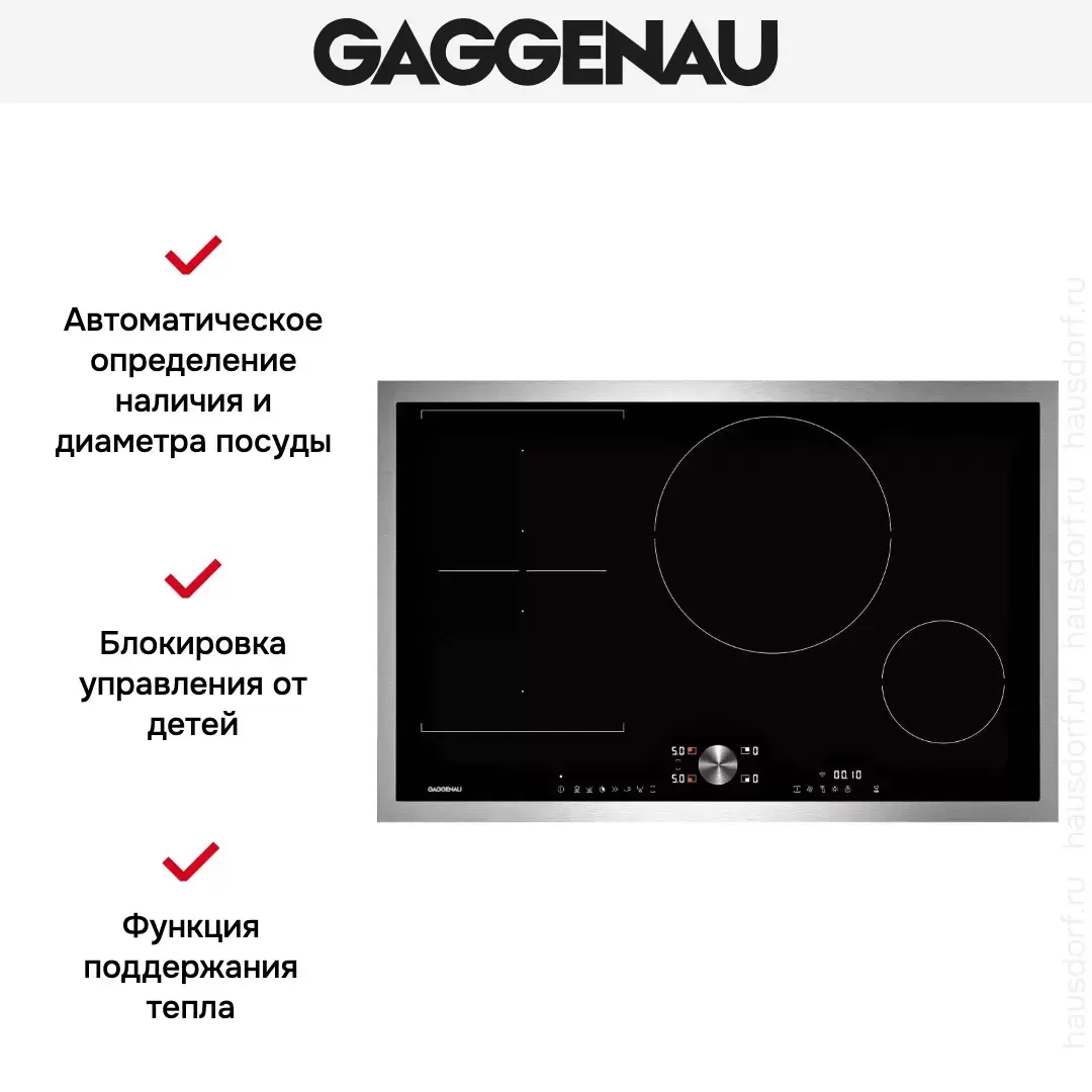 Gaggenau CI282111 — индукционная варочная панель с рамкой из нержавеющей стали. Имеет 4 зоны нагрева разной мощности, в том числе и прямоугольные, которые могут быть объединены в зону flex. Температуру посуды можно контролировать с помощью сенсора нагрева. Безопасность эксплуатации обеспечивают двухпозиционные индикаторы остаточного тепла.
