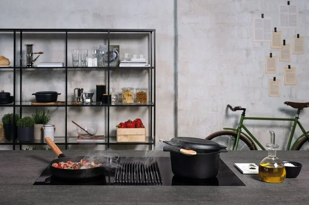 Встроенная вытяжка обеспечивает отвод или рециркуляцию воздуха, поэтому прибор сочетает функции варочной поверхности и эффективной системы очистки. В комплекте идут алюминиевый жироулавливающий фильтр и керамические угольные фильтры длительного использования, что снижает необходимость частой замены расходников. Производительность до 480 м³/ч позволяет быстро удалять пар и запахи, а уровень шума от 41 до 67 дБ делает работу достаточно комфортной даже при высокой мощности. Класс энергопотребления A+ гарантирует низкие эксплуатационные расходы.