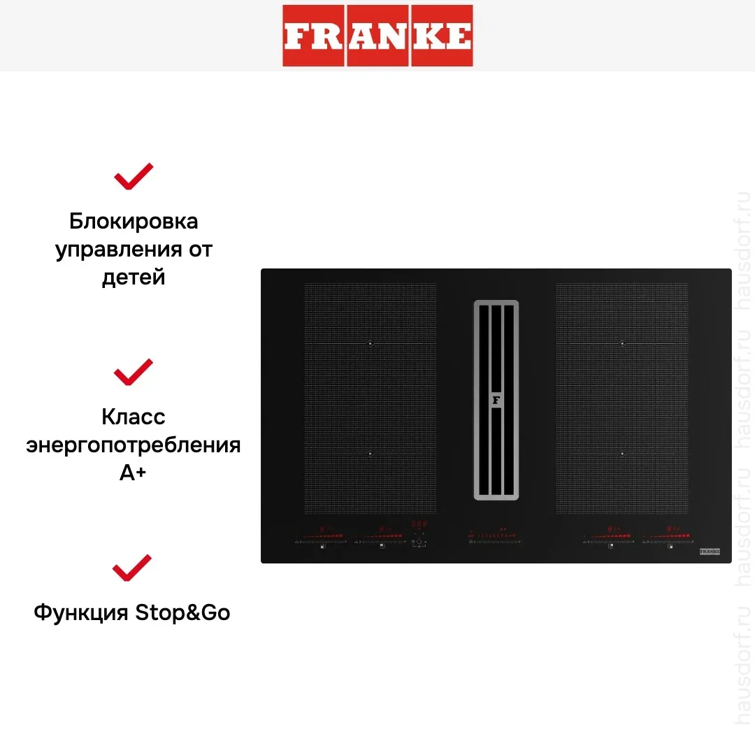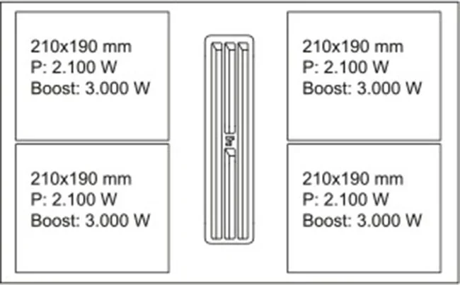 По функционалу это независимая индукционная панель с электрическим подключением. Электронное управление реализовано через сенсорный слайдер TouchSlider, есть таймер и функция паузы Stop&Go для кратковременной остановки приготовления. Индикатор остаточного тепла информирует о безопасном взаимодействии с поверхностью. Зона Bridge позволяет объединять конфорки для крупной посуды. Четыре индукционные конфорки 210×190 мм каждая развивают по 2,1 кВт, суммарная мощность — 7,4 кВт с режимом Booster для быстрого разогрева.