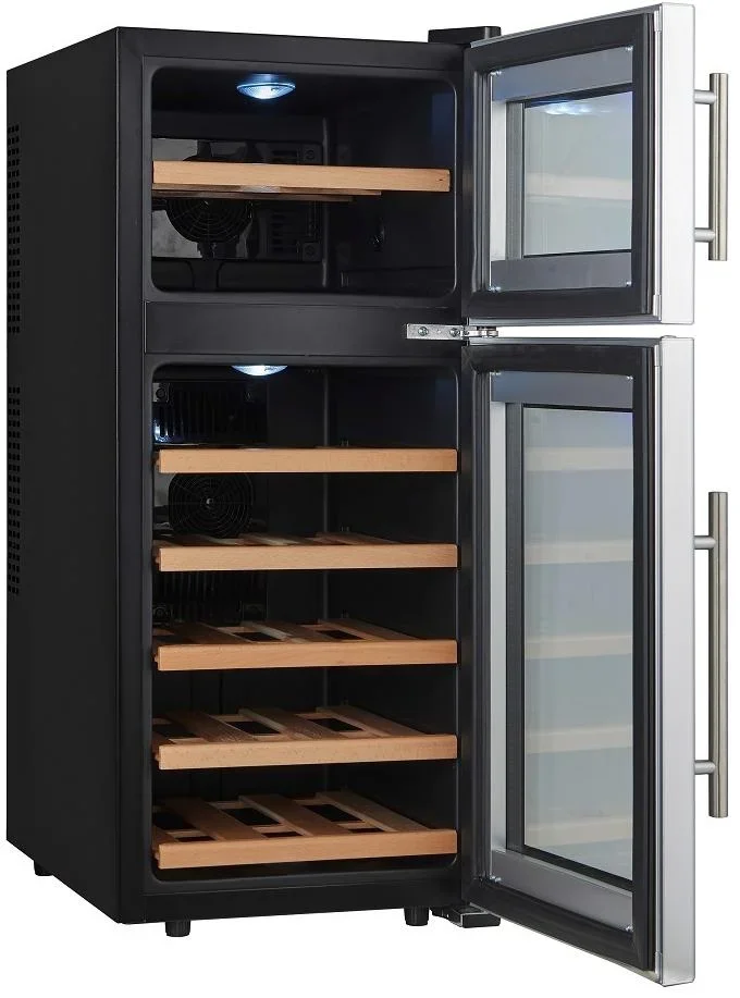 Двухтемпературная конструкция дает возможность одновременно хранить разные категории напитков. Верхняя секция поддерживает диапазон 7-18 °C, нижняя — 11-18 °C, что удобно для красных и белых вин. Термоэлектрическое охлаждение (принцип Пельтье) обеспечивает тихую работу и минимальные вибрации, важные для сохранности осадка в бутылках. Прибор потребляет очень мало энергии — всего 0.027 кВт·ч за сутки, а уровень шума 38 дБ делает его комфортным для жилых помещений.