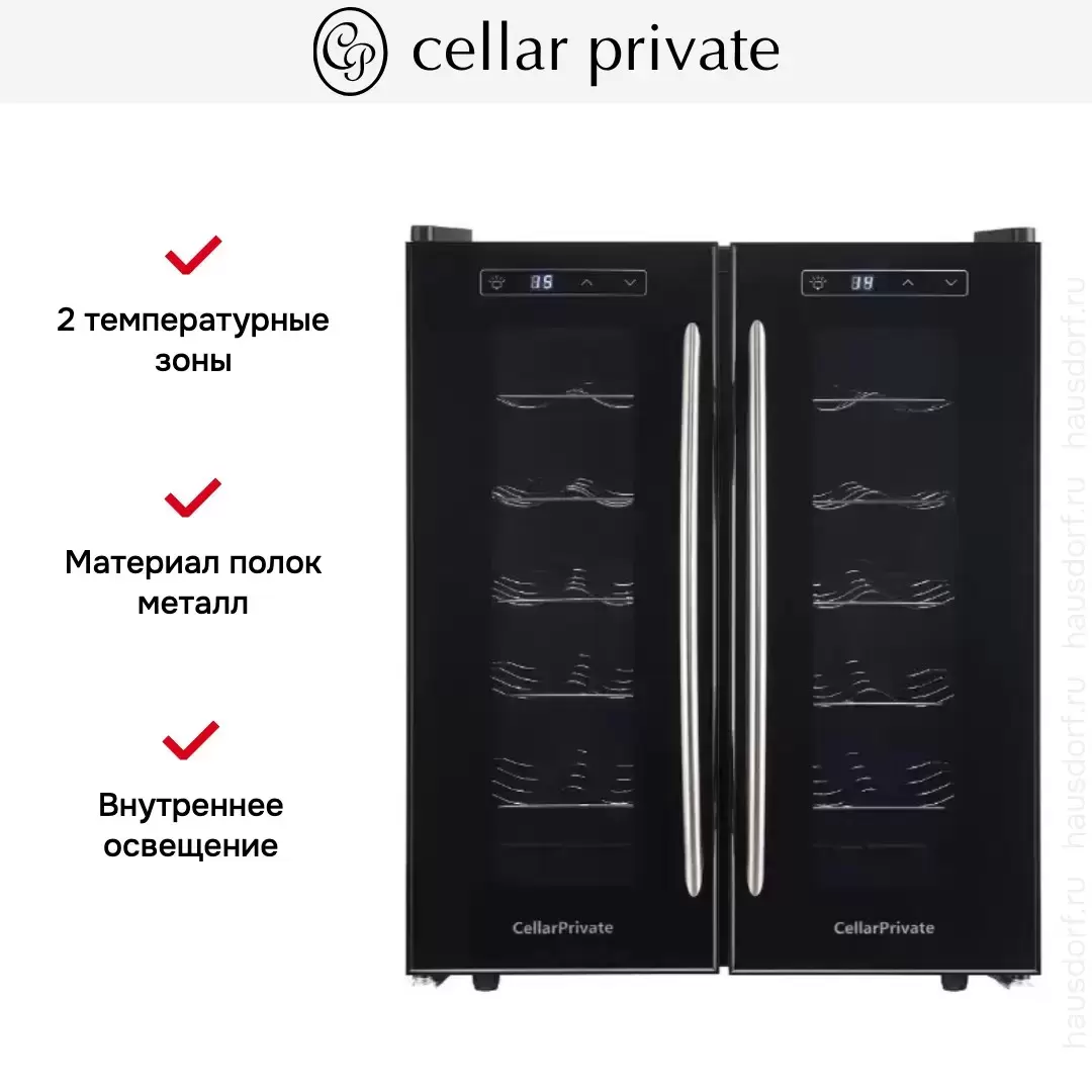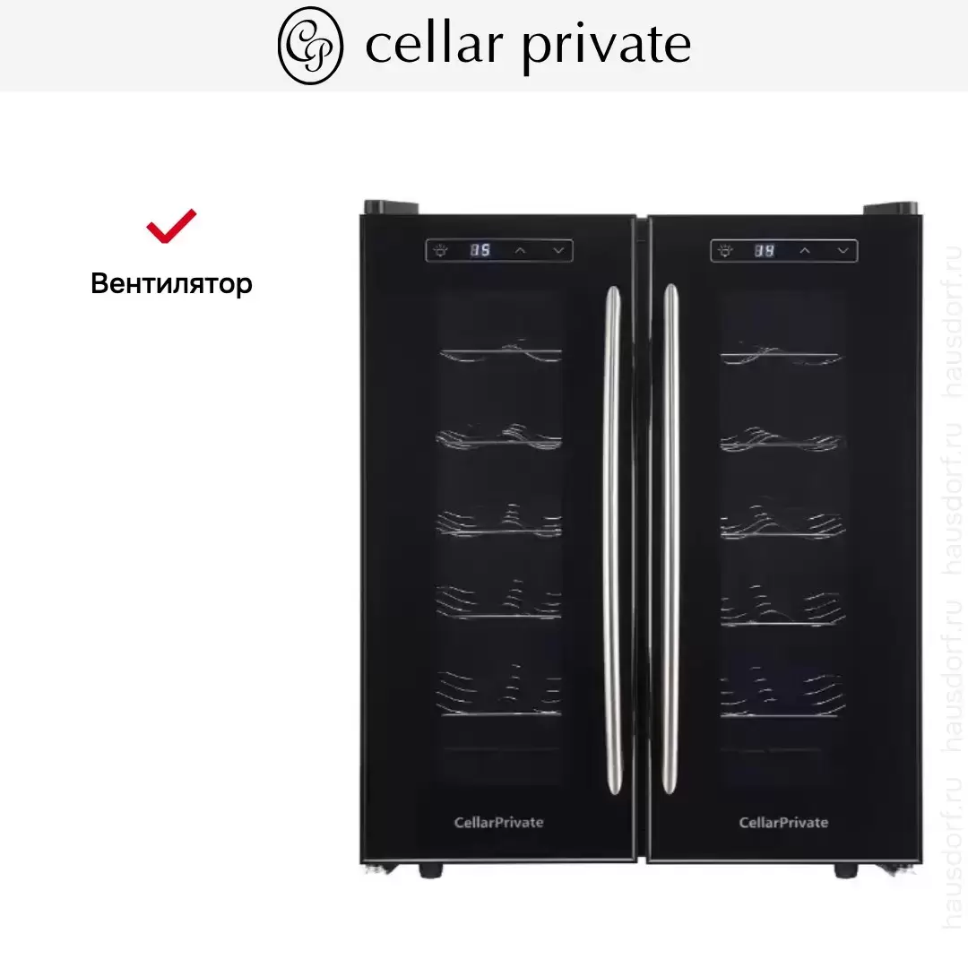 Винный холодильник CellarPrivate CP024-2T имеет две температурные зоны, в которых одновременно можно хранить разные сорта алкоголя и выставлять разные сочетания настроек. Он устанавливается отдельно, что удобно, если у вас есть специальное помещение — кладовая, погреб и т.д. Благодаря компактным размерам данная модель — отличный выбор для офиса, гостиничного номера. Количество бутылок, которое можно разместить с учетом полной комплектации и из расчета объема бутылки 0,75 л, — 24 шт.