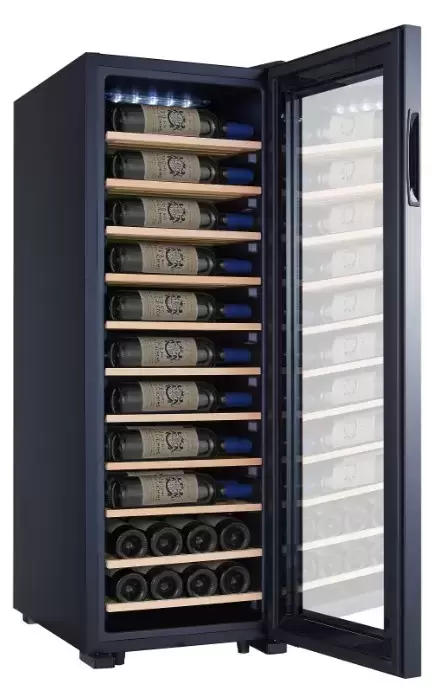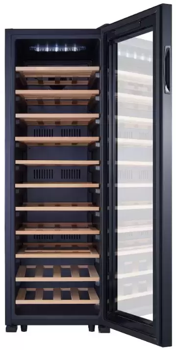 Стеклянная дверь — дополнительный изящный штрих к общему дизайну модели. Специальное покрытие защищает вино от влияния ультрафиолетовых лучей, которые проникают, если шкаф находится в солнечной комнате. Цвет корпуса — черный.