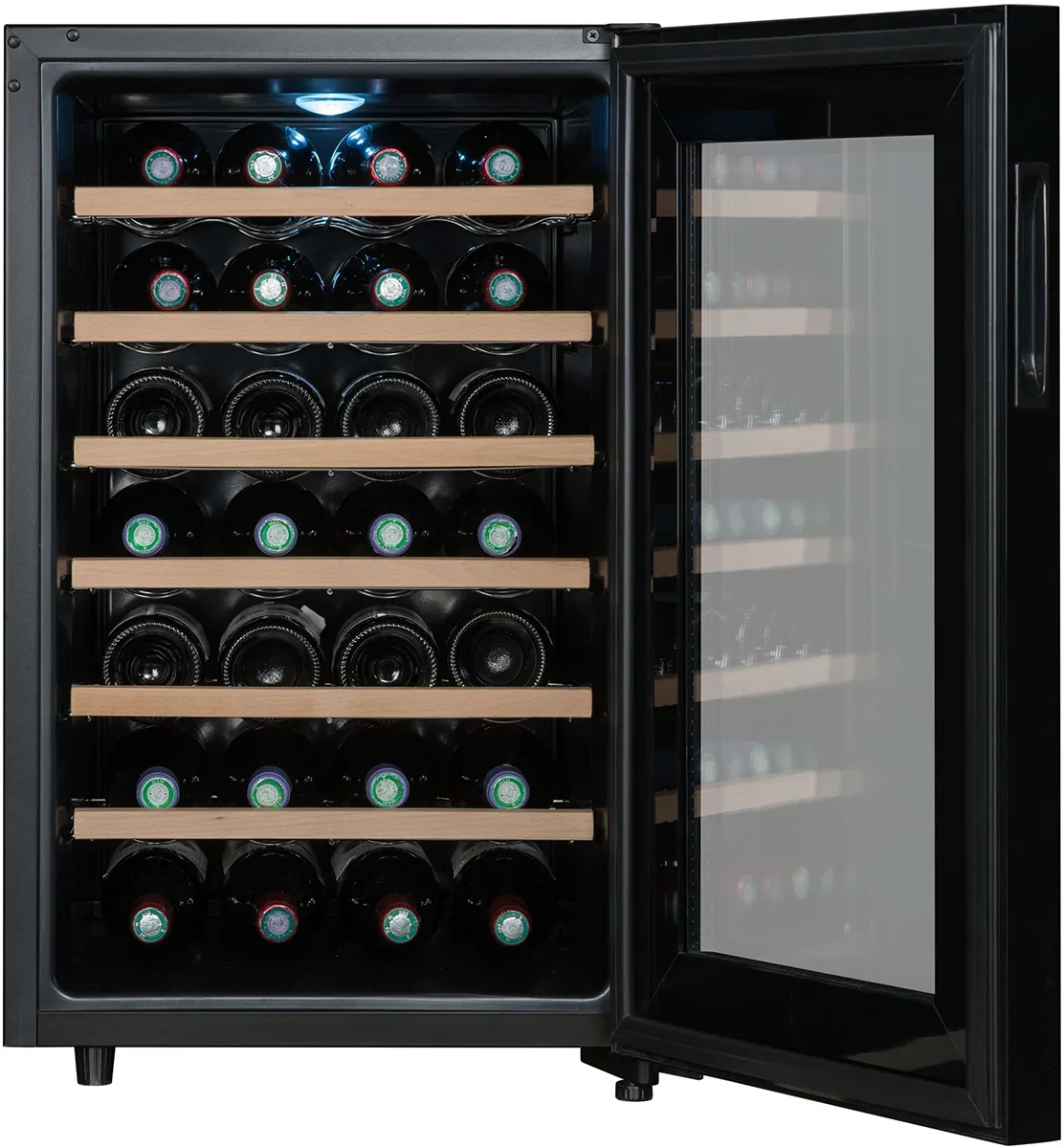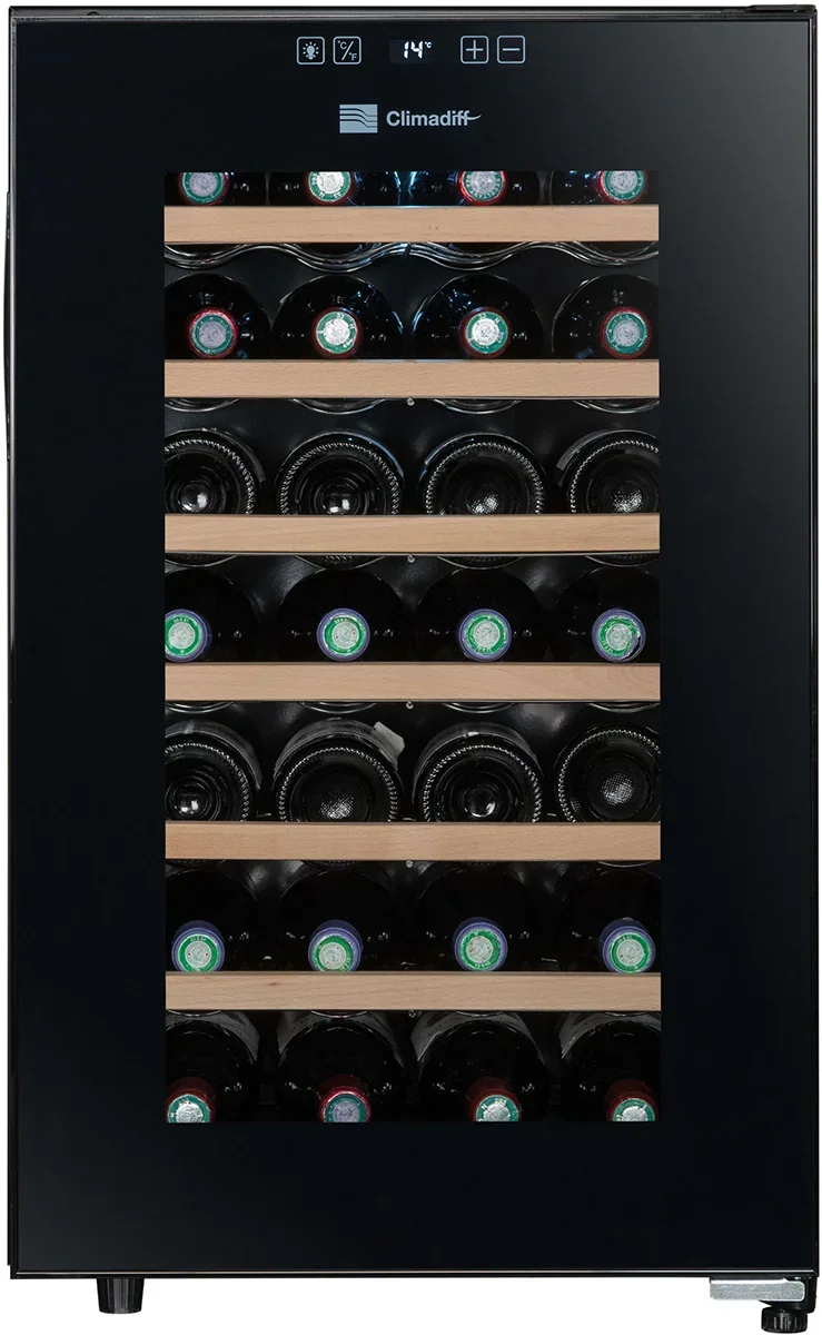 Винный шкаф Climadiff CC28 — монотемпературный отдельно стоящий прибор в строгом чёрном корпусе. Его компактные габариты 73.5×45×52.8 см экономят место на кухне или в мини-баре. Вместительность 28 бутылок по 0,75 л и полезный объём 70 литров делают модель удобной для домашней коллекции и приёма гостей. Дверь со стеклопакетом и тонировкой защищает напитки от УФ‑лучей, а правый дверной упор учитывайте при выборе места установки.